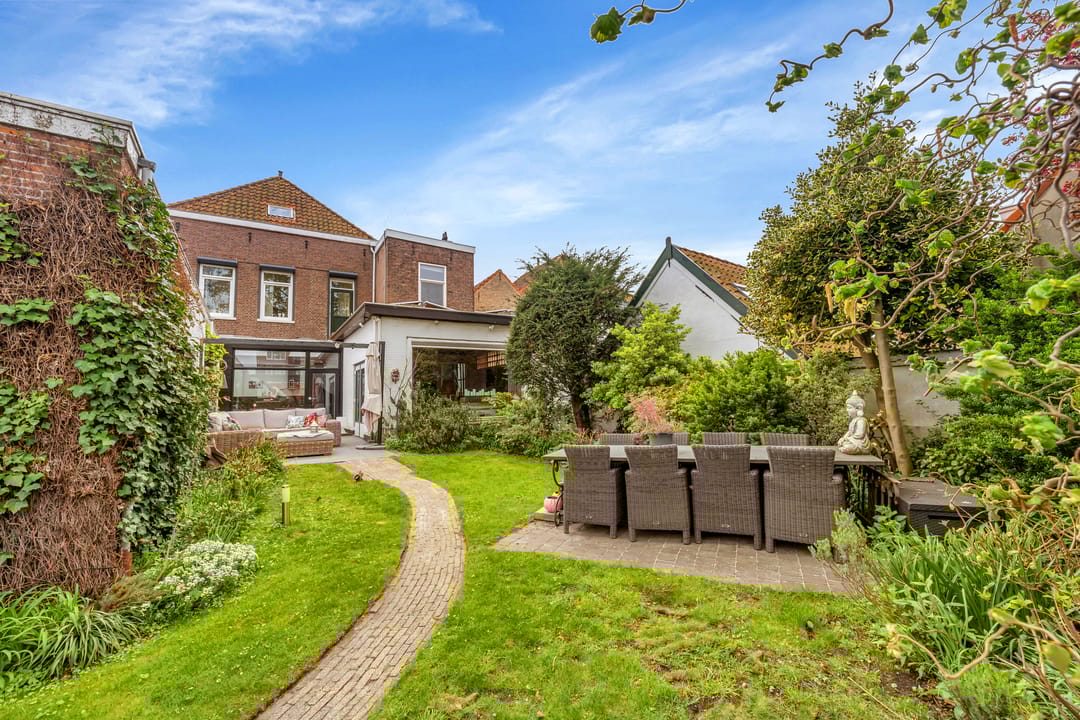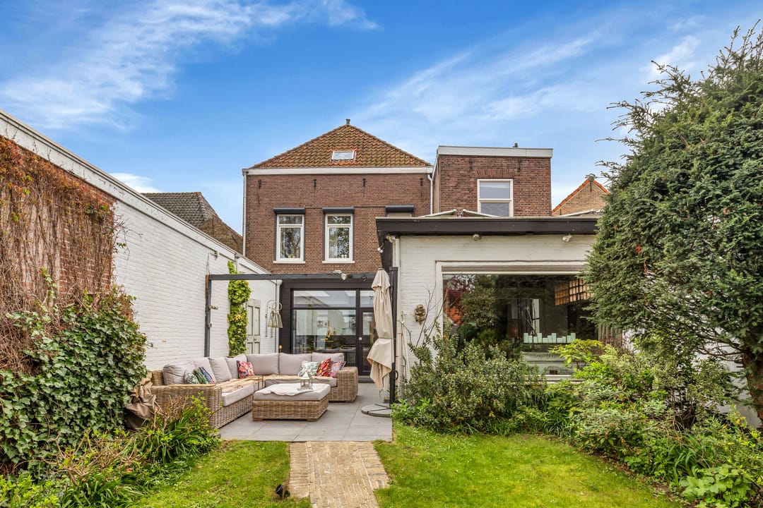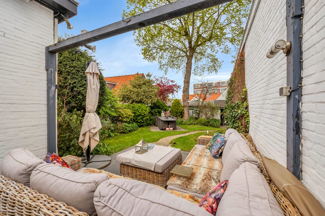 Via de woonkamer en keuken heb je toegang tot de fijne groene achtertuin met stenen berging en achterom.