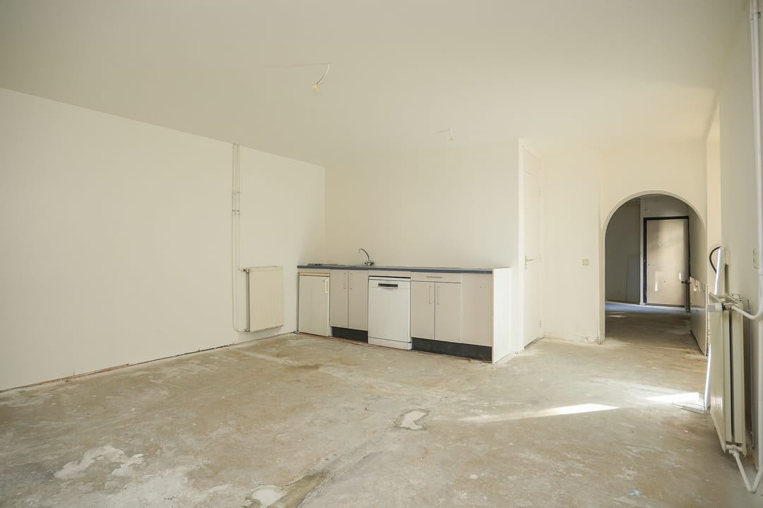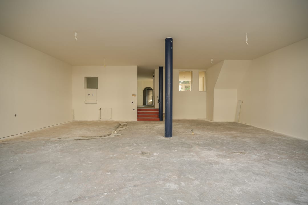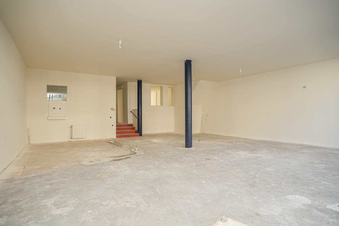 Er zijn enkele dragende muren maar er is een grote, functionele en overzichtelijke ruimte ontstaan.