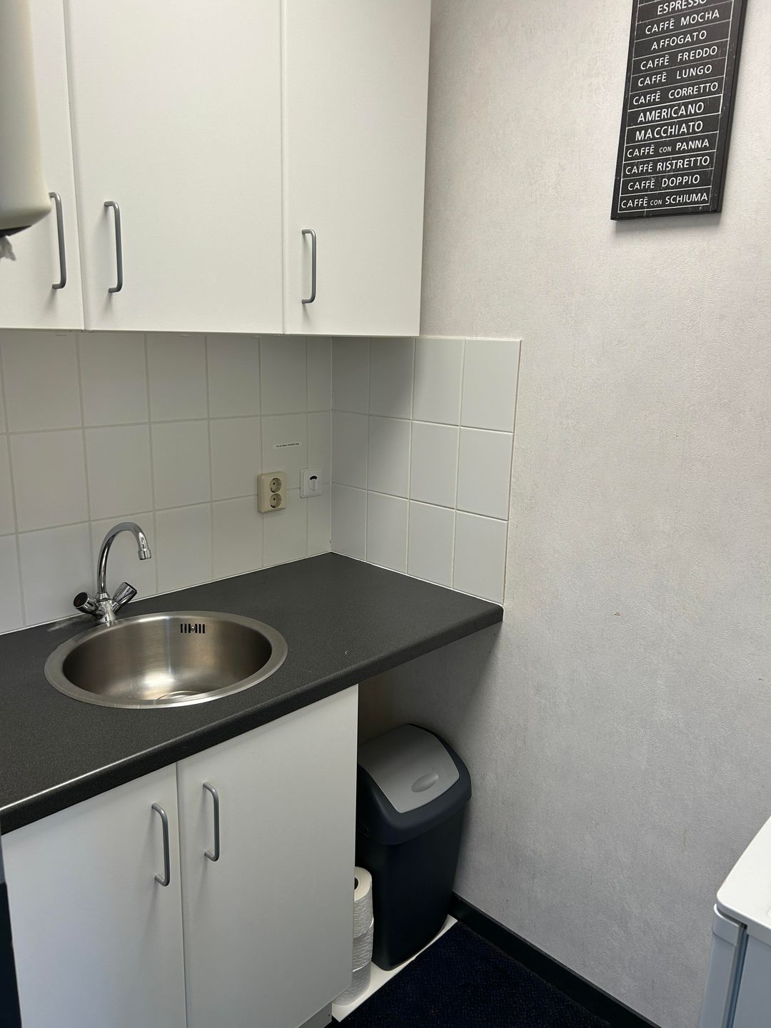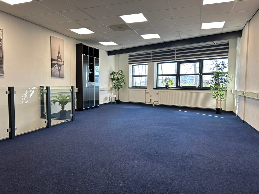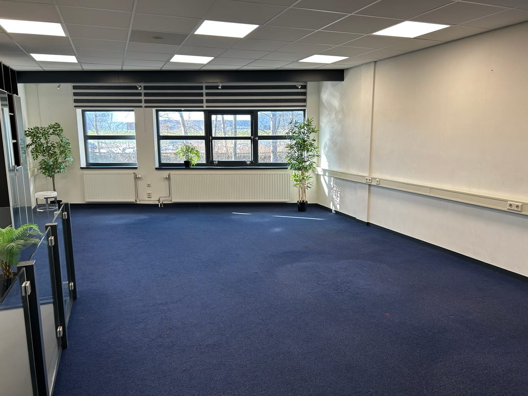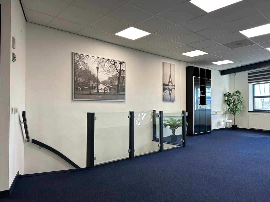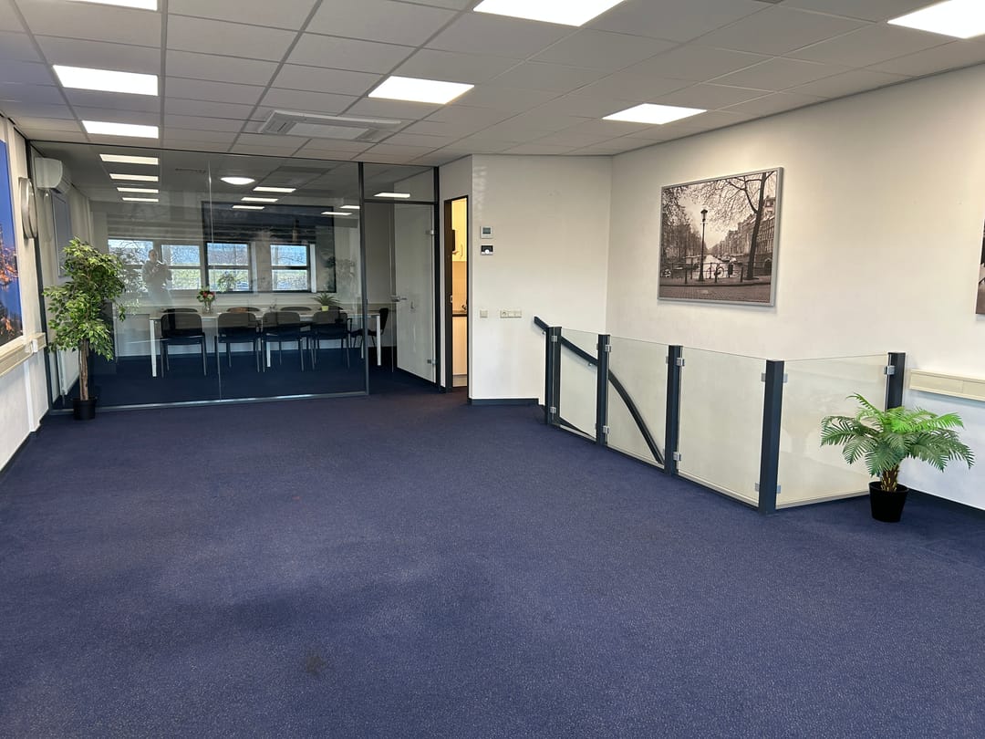 - aan de achterzijde is door middel van een glazen scheidingswand een spreekkamer/vergaderruimte gecreëerd.