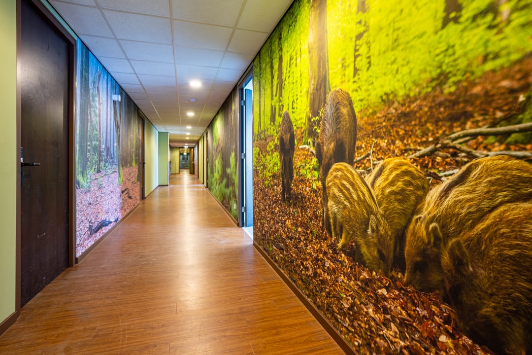 Binnen kijk je niet direct op echt groen, maar door de fraaie wandbekleding met natuurfoto’s wordt het buitengevoel tot in de werkomgeving doorgetrokken.