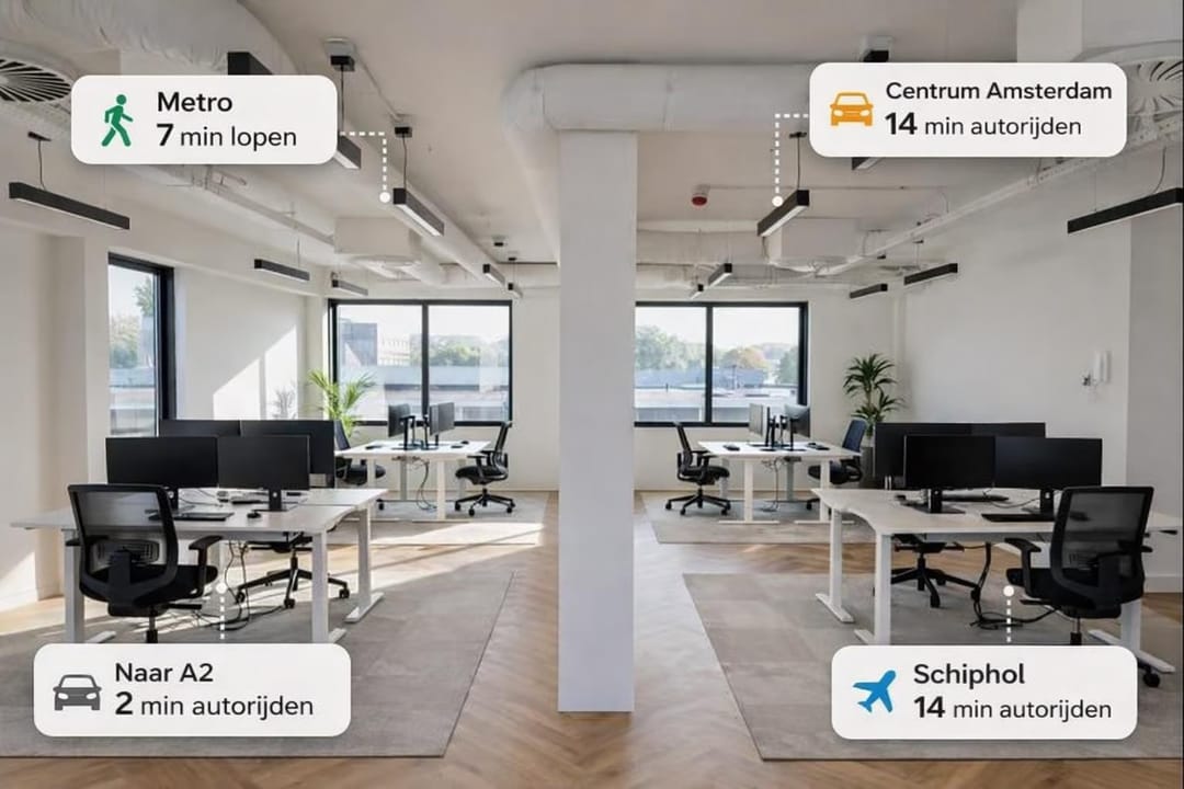 Deze kantoorruimte betreft een halve verdieping en is ingericht als open kantoorvloer. Door de grote raampartijen beschikt de ruimte over veel daglicht en een prettige werksfeer. De indeling is flexibel en uitstekend geschikt voor meerdere werkplekken en overleg.