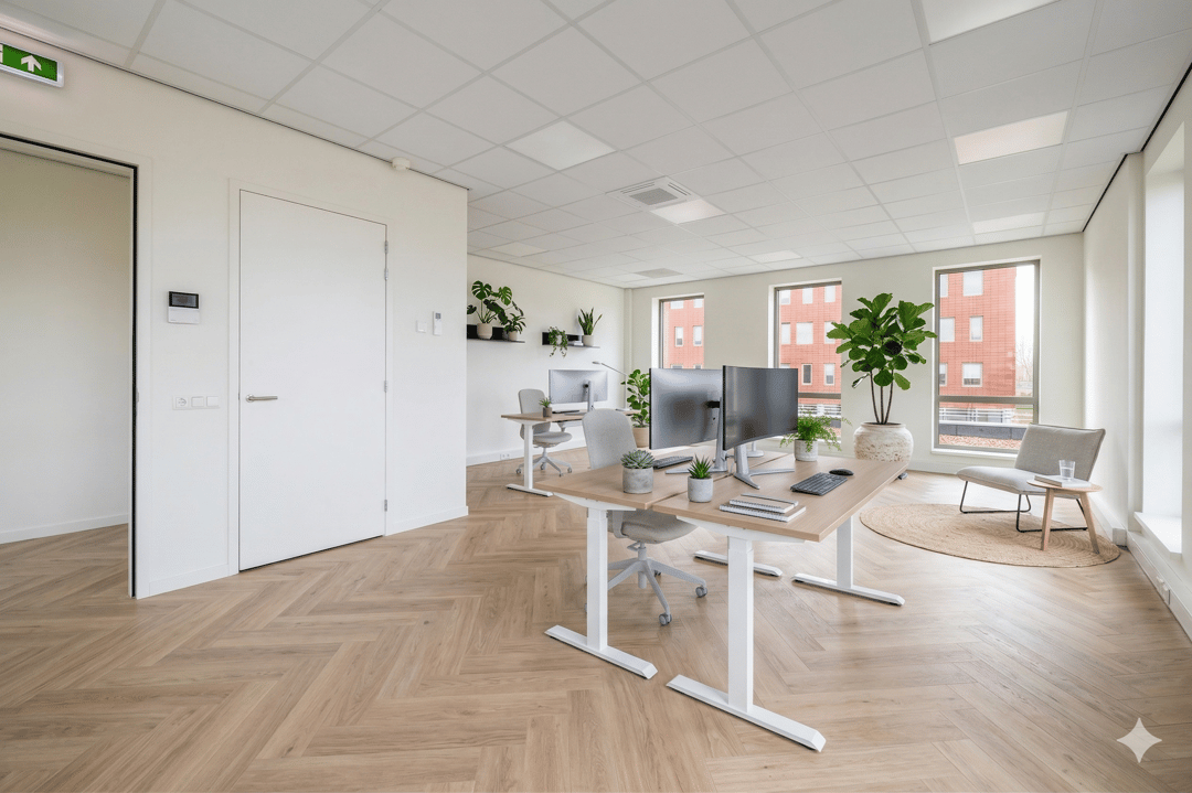 Dit kantoor ligt op de kop van het gebouw. Dankzij de grote raampartijen aan drie zijden stroomt het daglicht naar binnen, wat zorgt voor een buitengewoon lichte, energieke en inspirerende werkomgeving.