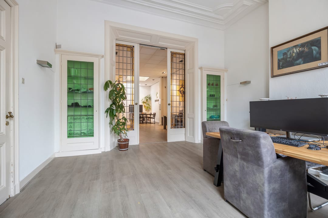 Op de begane grond van dit statige herenhuis mogen wij u deze royale kantoorverdieping met eigen tuin aanbieden.