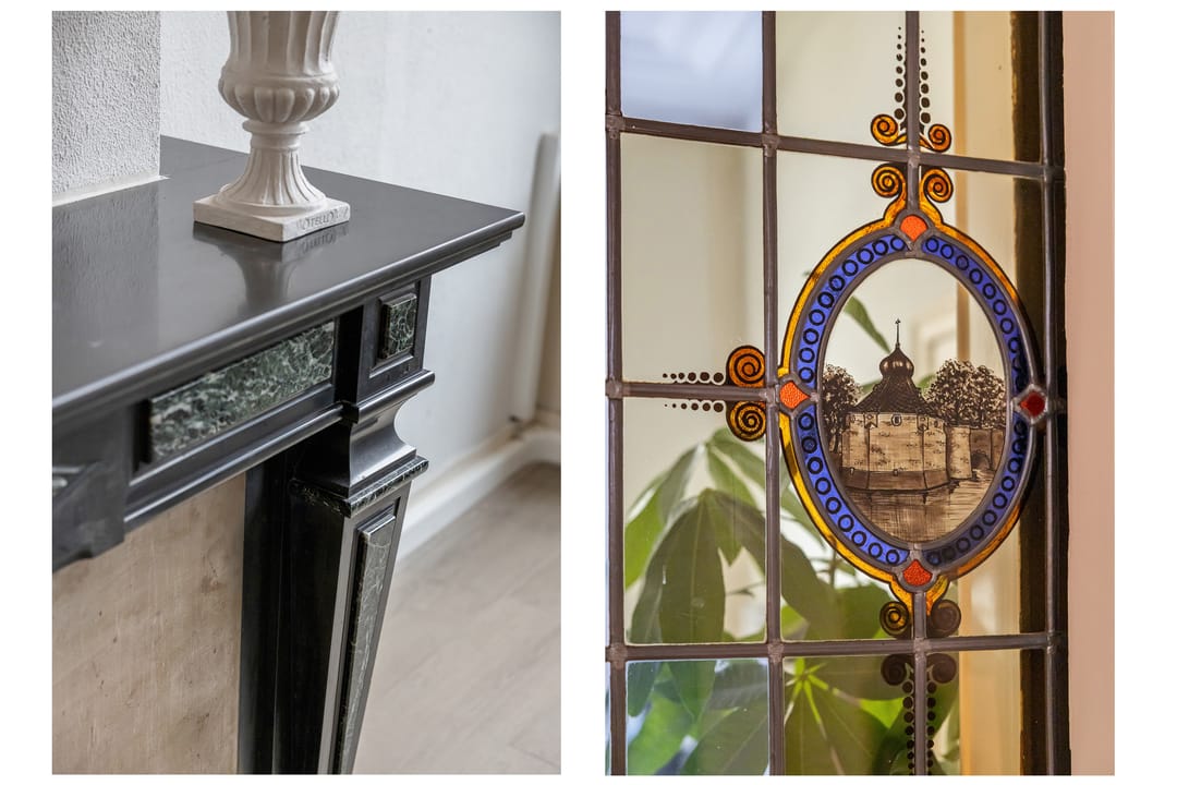 Prachtige voorkamer (ca. 5.40 x 5.05m) met glas-in-lood rampartijen, een hoog plafond (3.95m) met de authentieke ornamenten en sierlijsten en de originele schouw.