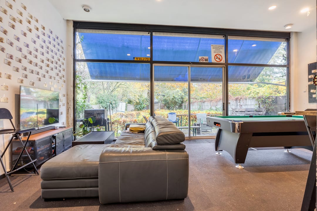 Middels schuifdeuren voorzien van glas-in-lood en kastruimte in de omtimmering is er toegang tot de royale middenkamer (ca. 9.56 x 5.05m) met diverse inbouwspots, 2 grote dakramen en toegang tot de kluis (ca. 3.06 x 2.35m).