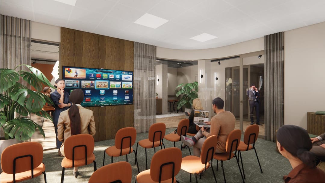 Denk aan een sociaal hart met lunchgelegenheid, een representatieve host, een self-service grab-and-go mini market en sfeervolle lobby, vergaderruimtes, flexplekken én goede koffie.
