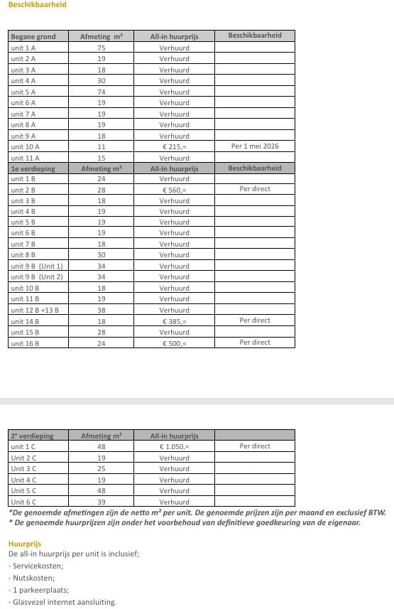 De all-in huurprijs per unit is inclusief;