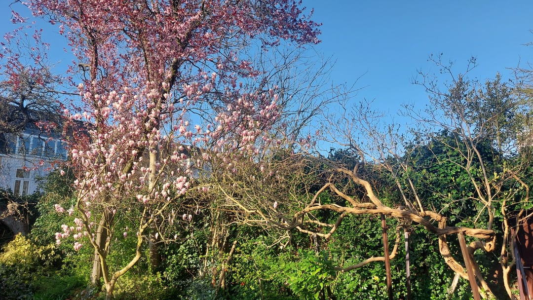 Vanuit de serre is de romantische tuin te bereiken. Mooie oude bomen en beplanting, een serene plek om even tot rust te komen.