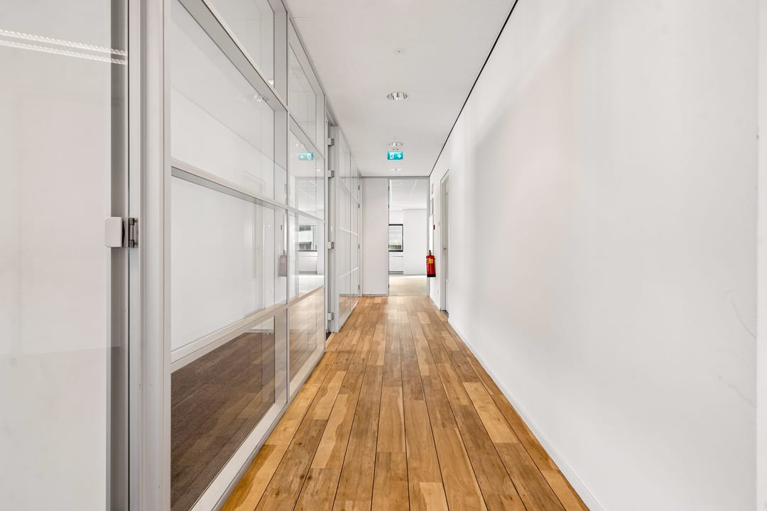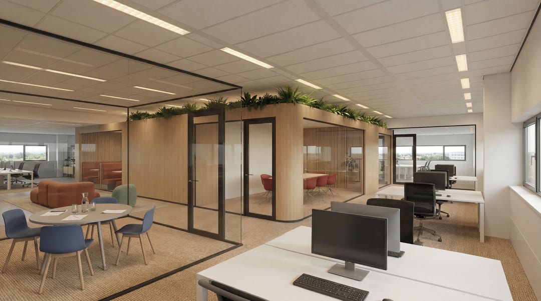 • Indeling: Een mix van moderne transparante wanden en metal stud wanden voor een lichte en open sfeer.