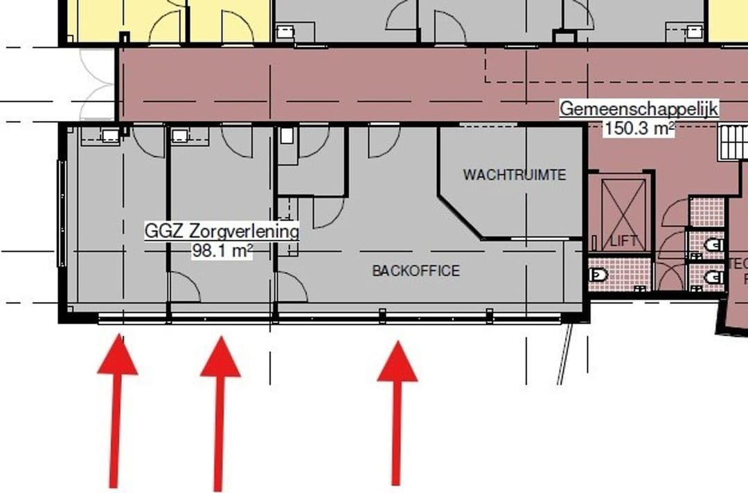 Drie aaneengesloten en met elkaar verbonden units van totaal ca. 98,1 m². De units zijn gelegen op de eerste verdieping en zijn per direct voor verhuur beschikbaar.