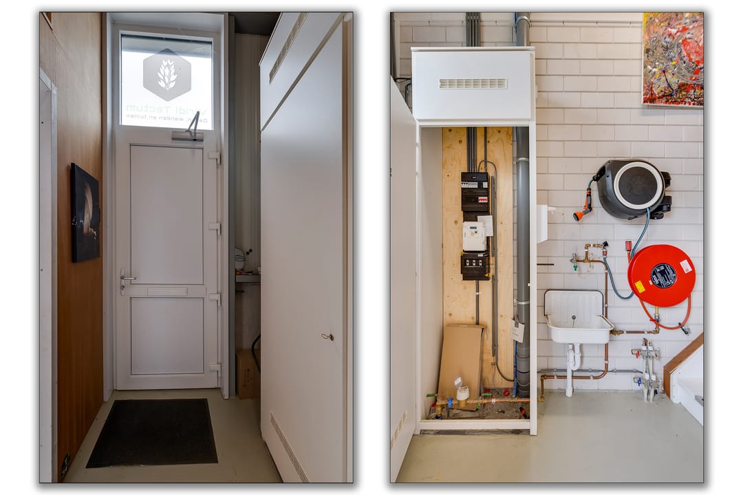 Scheidingswand tussen bedrijfsruimte en opgang kantoorruimte.