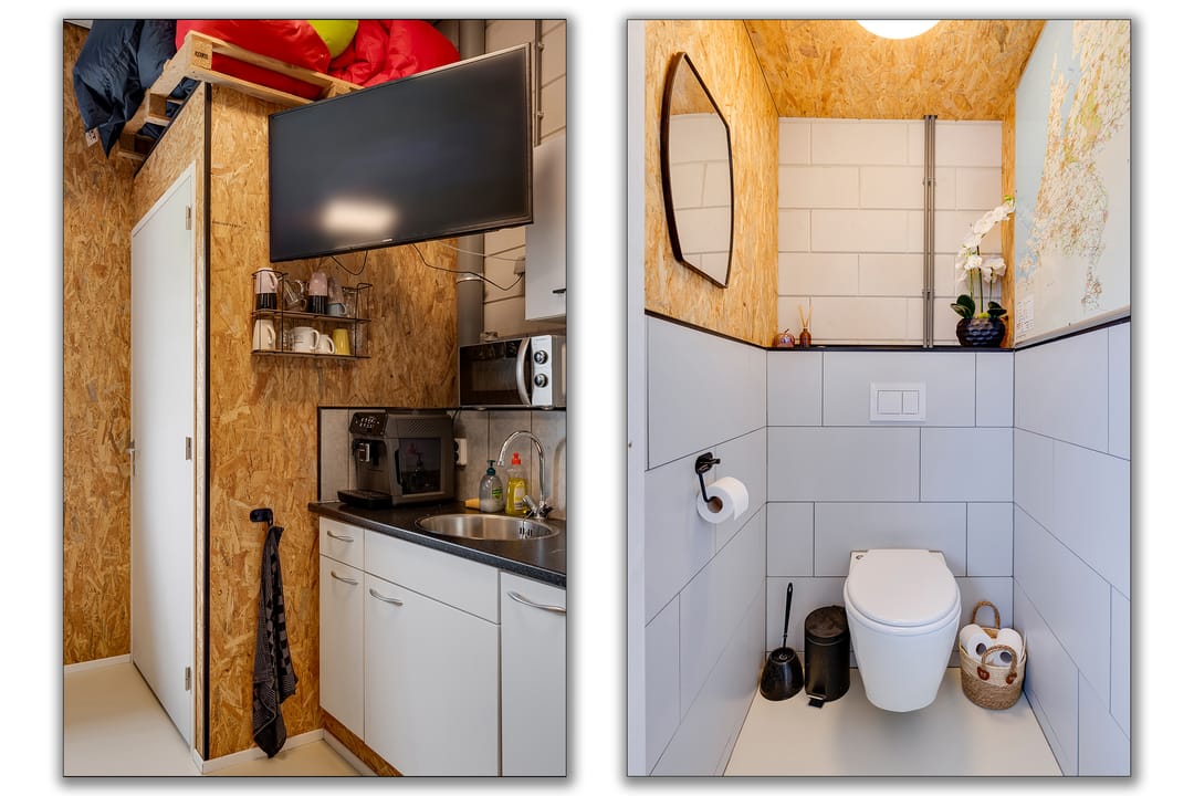Enkel toilet in de bedrijfsruimte voorzien van betegeling en fonteintje;