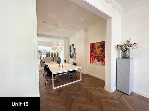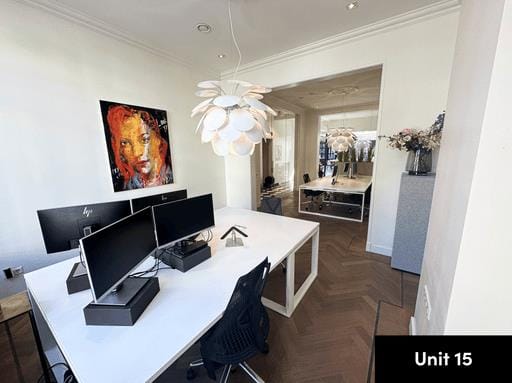 De volledig gemeubileerde kantoorunits bevinden zich op de begane grond aan de voorzijde van het gebouw. Door de hoge raampartijen beschikken de ruimtes over veel natuurlijk licht.