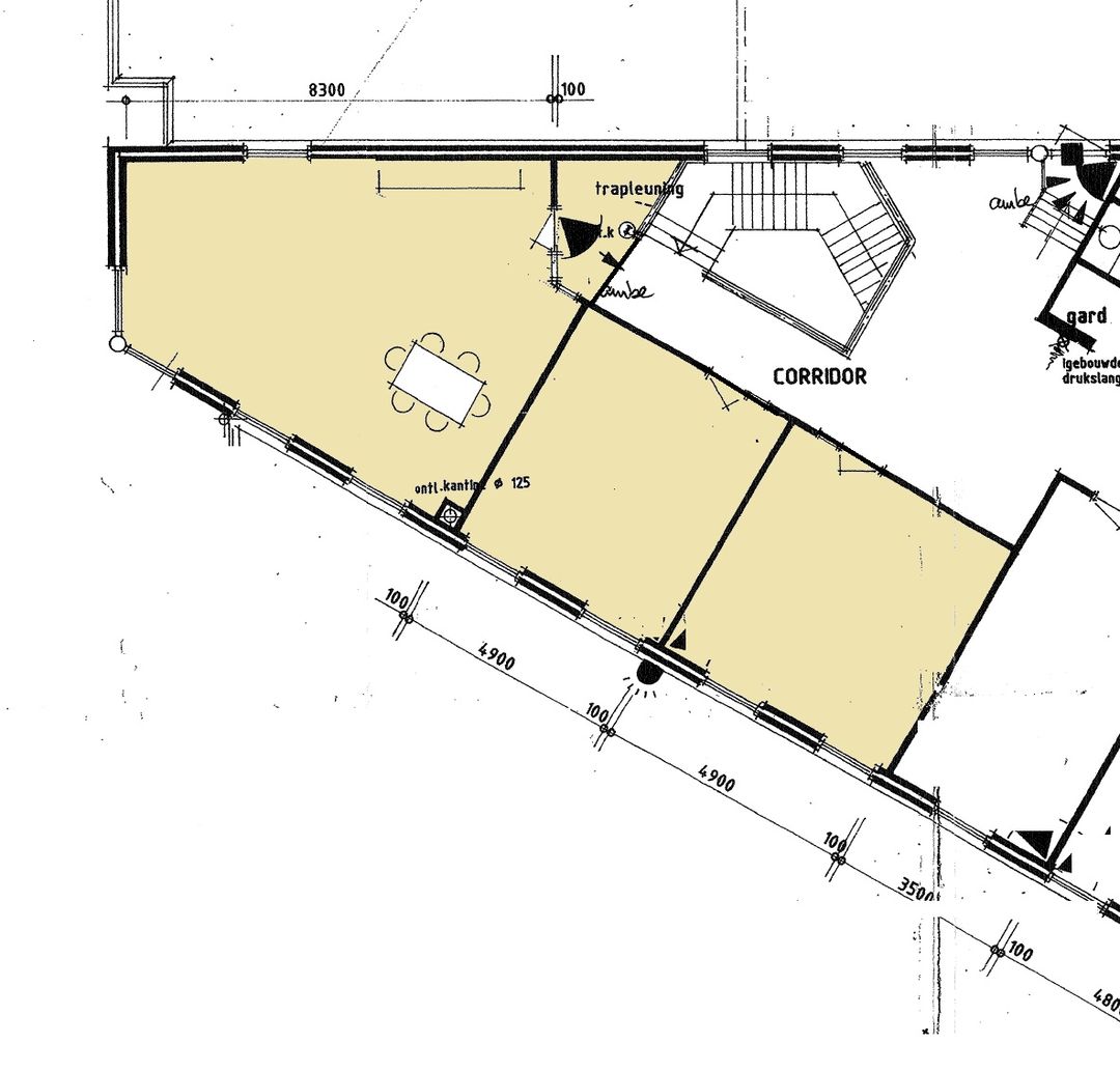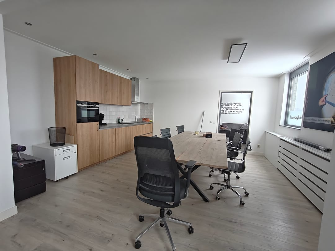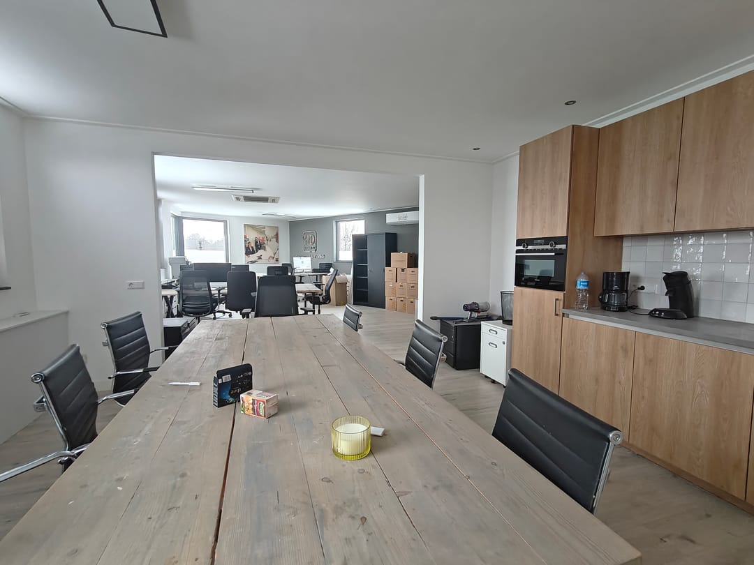 De entree verleent toegang tot de eerste ruimte, die vrij kan worden ingedeeld. Deze ruimte heeft een perfecte verhouding tussen daglicht en afscherming. De raampartijen zijn aan de gehele zijden van het pand gesitueerd. Door de ligging op de eerste verdieping heeft deze ruimte veel privacy, maar zal de huurder wel goede uitkijk hebben op de toegang van het perceel. Zo zal een klant nooit over het hoofd worden gezien. Deze ruimte betreft ongeveer 75m2, met een half open doorloop naar de keuken met diverse inbouw apparatuur.