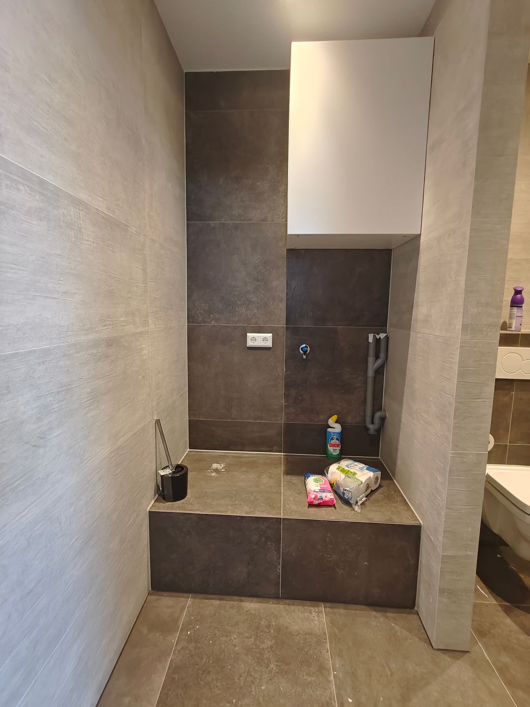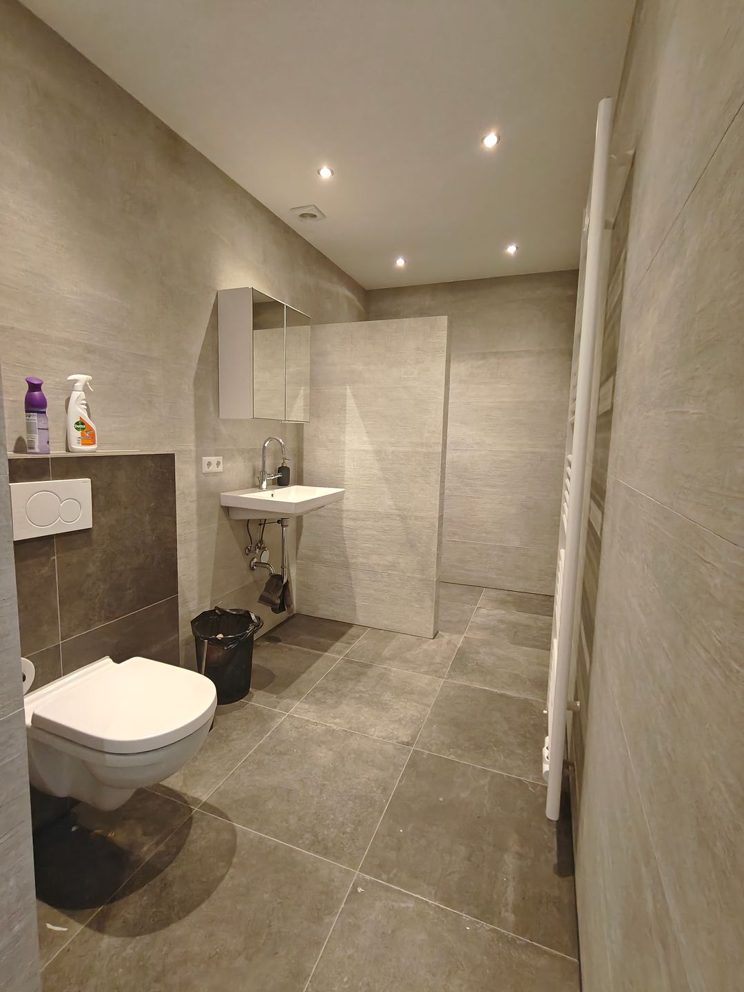 Via de derde ruimte kan men de sanitaire voorzieningen bereiken. Deze deur is vanzelfsprekend afsluitbaar. Hier bevindt zich een luxe afgewerkte badkamer met toilet en mogelijkheid voor wasmachine aansluiting.