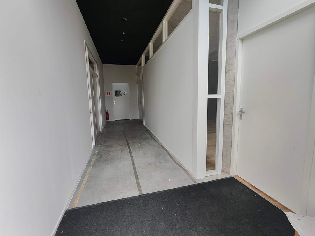 De bedrijfsruimte bevindt zich op de eerste verdieping, boven een ander (administratief) kantoor. Het pand is via de voorzijde eenvoudig bereikbaar. Via de toegangsdeur bereikt men de metalen trap met houten treden, welke op de eerste etage uitkomt. Aan de linkerzijde bevindt zich hier de toegangsdeur naar de tweede bedrijfsruimte, welke reeds is verhuurd. De rechter toegangsdeur betreft het object van deze advertentie.