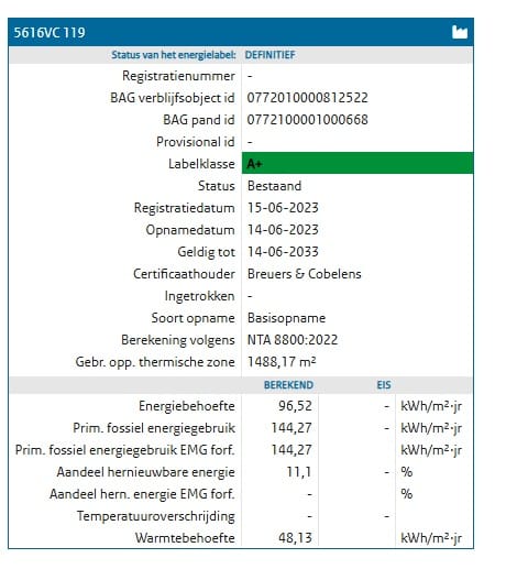 Het kantoorgebouw beschikt over het energielabel A+ welke geldig is tot 14 juni 2033.