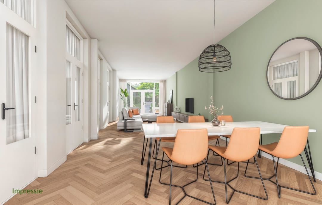 begane grond: entree, portaal met tussendeur naar de lange gang (voormalige steeg) met luxe toilet en het trappenhuis. Onder de trap bevindt zich een kast met toegang tot de kelder. Werkkamer aan de voorzijde. Rechts van de gang een grote multifunctionele ruimte, van elkaar te scheiden door openslaande deuren. Aan de achterzijde zijn antracietkleurige plavuizen met vloerverwarming aangebracht. Openslaande deuren naar de tuin. De multifunctionele ruimte aan de linkerzijde kan via 5 x openslaande deuren in verbinding met de rechterruimte worden gesteld. De ruimte in het midden is voorheen in gebruik geweest als keuken.