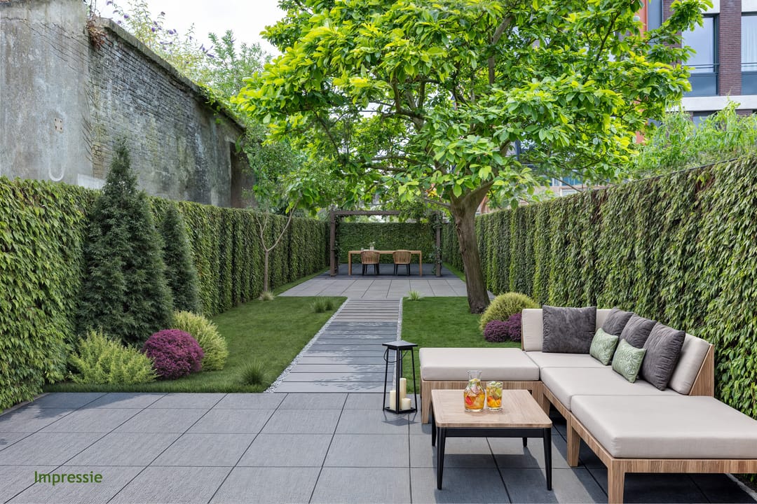 *Diepe achtertuin, gesitueerd op het westen, met (oude) houten schuur en een achterom naar de Raam.