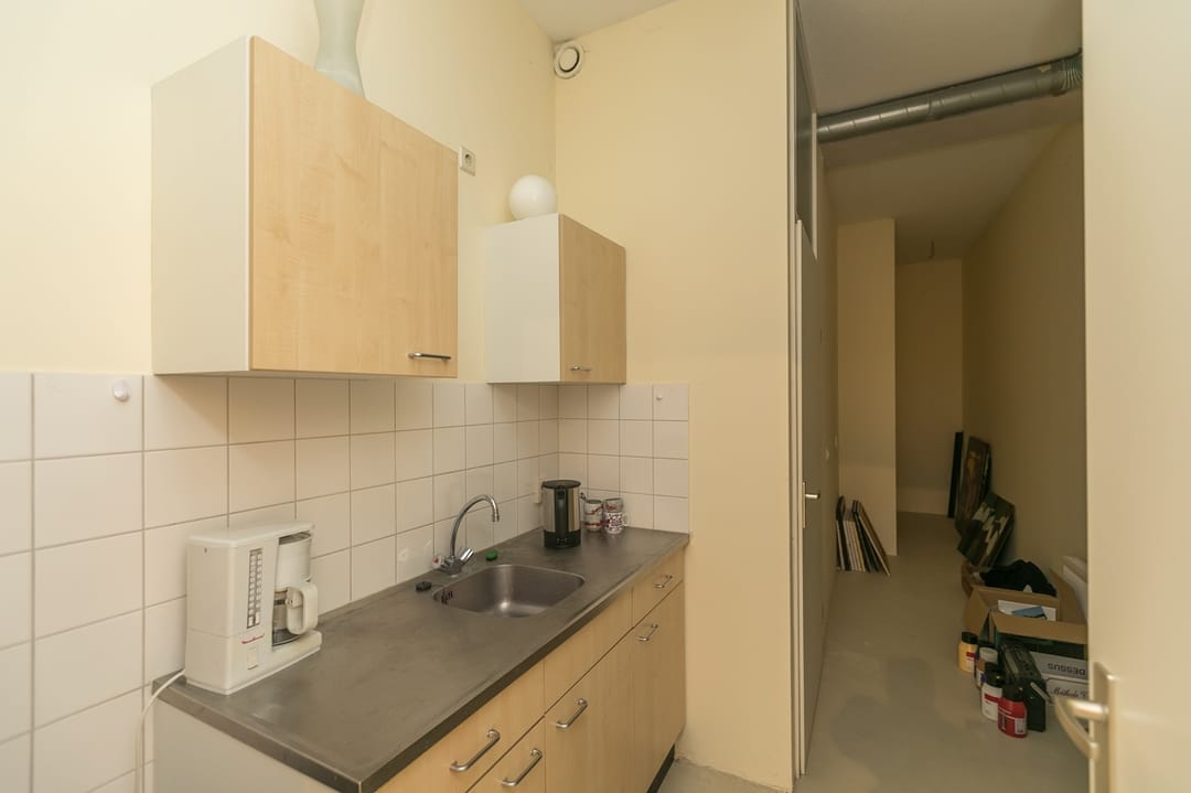 Via de entree direct in de rechthoekige open ruimte met industriële looks. De pantry, toilet en opslag zit achter in het pand in afgesloten ruimte.