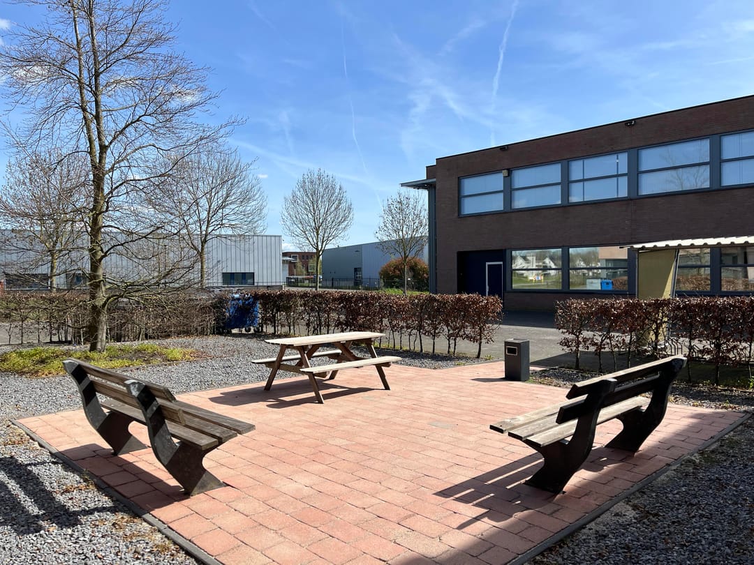 Het terrein beschikt over vele parkeerplaatsen en een groene buitentuin met zitjes.