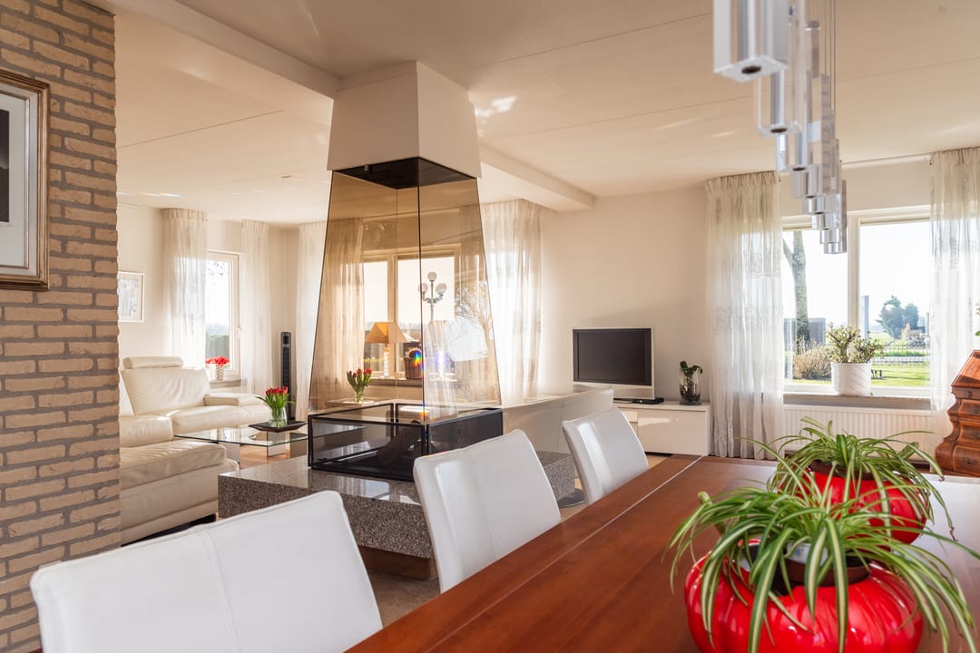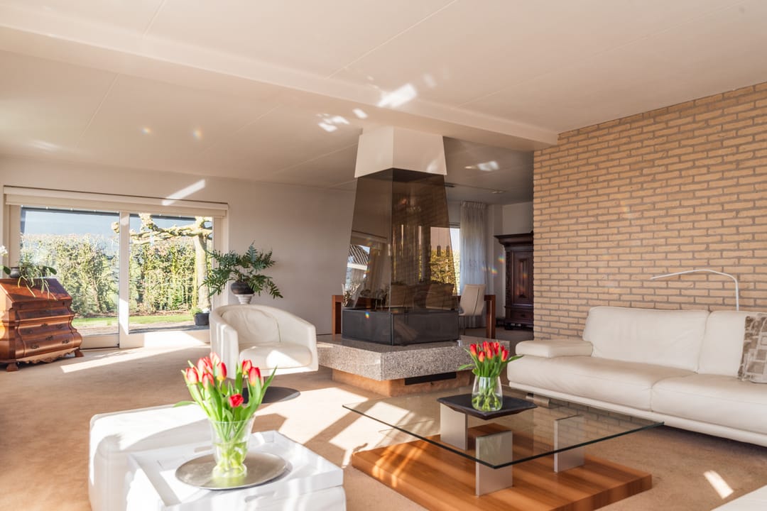 Een sfeervolle haardpartij vormt het hart van deze woonruimte.