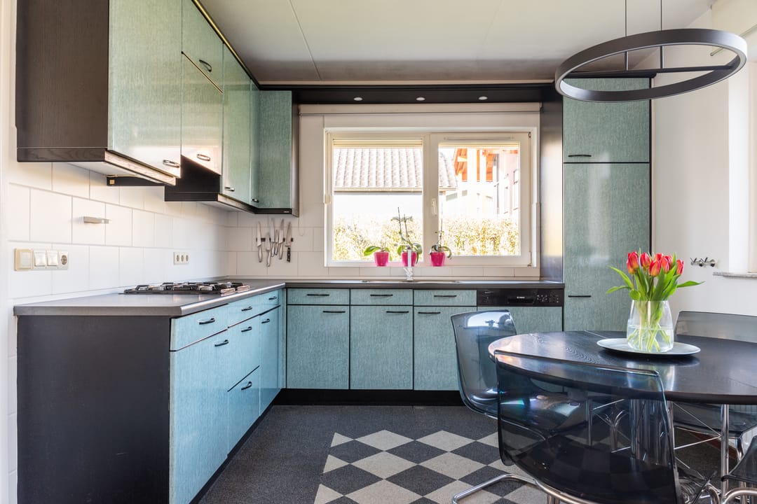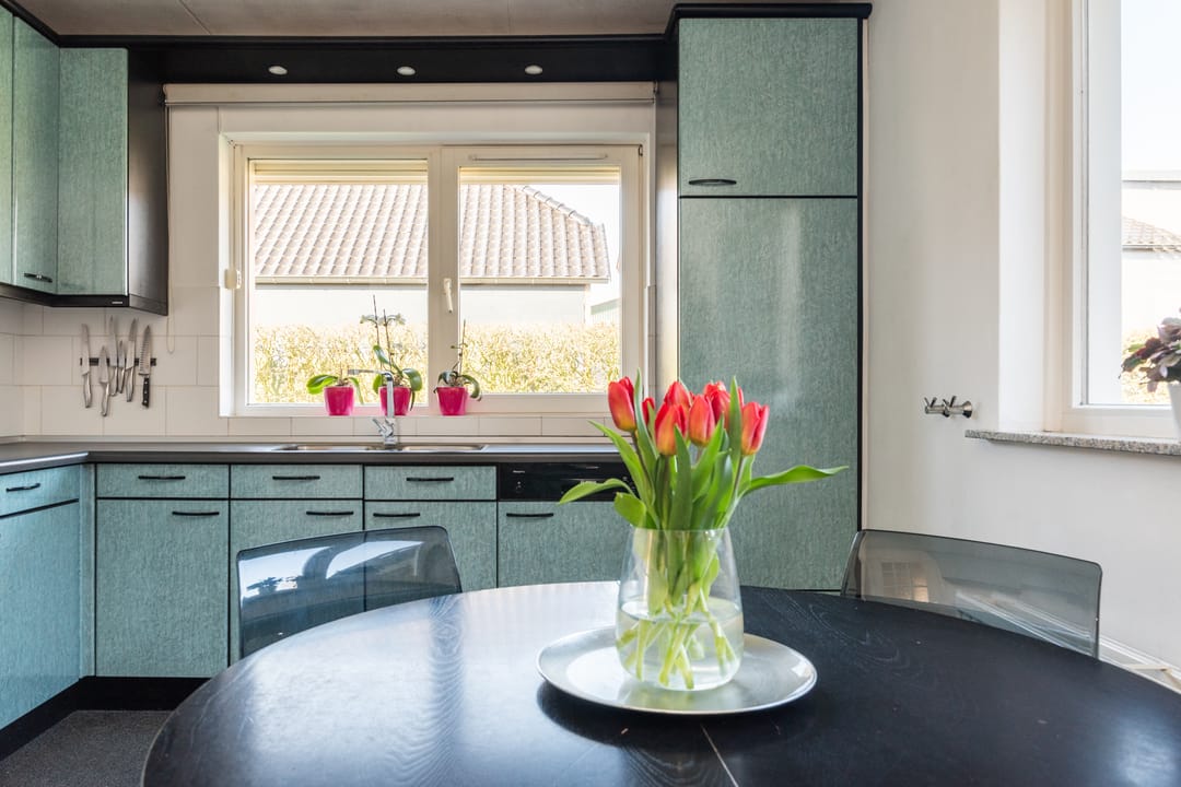 De woonkeuken ligt aan de achterzijde en is voorzien van een complete inbouwkeuken met gaskookplaat, afzuigkap, vaatwasser, koelkast, vriezer en combi-oven.