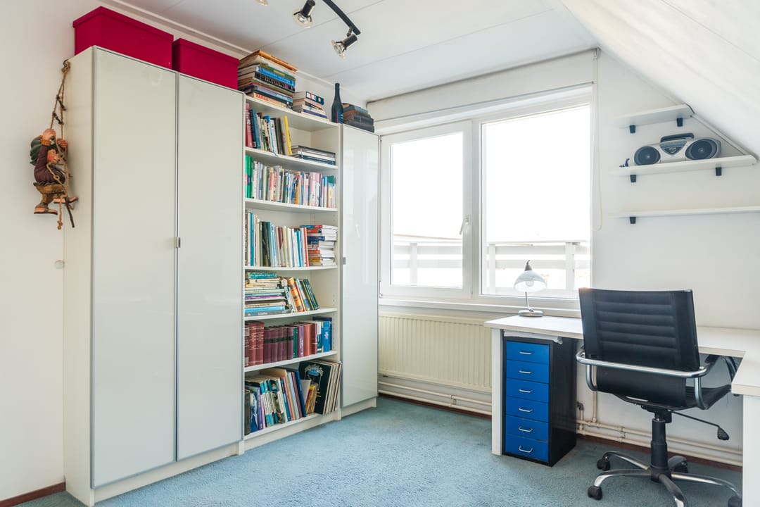Aan de voorzijde is een fraai kantoor of ontspanningsruimte gecreëerd met directe toegang tot het zonovergoten balkon.