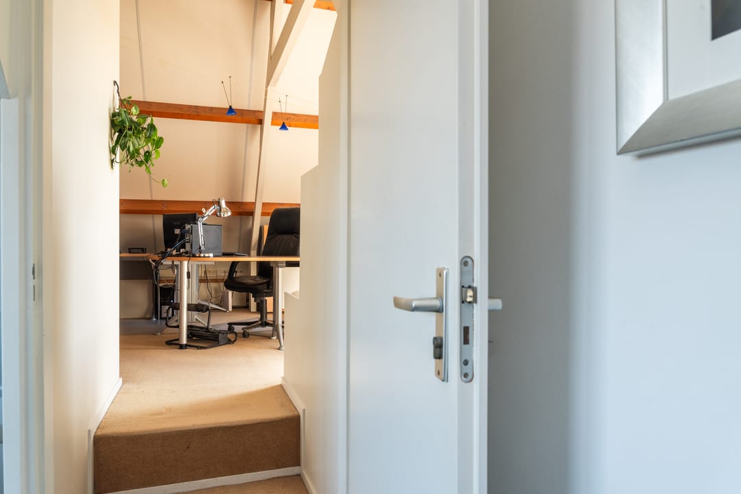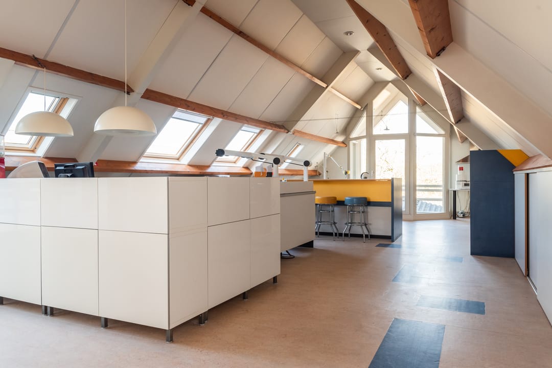 Via een vaste trap bereikt u de verdieping boven het bedrijfsgedeelte – een ruimte die werkelijk verrast door haar lichte, open karakter.