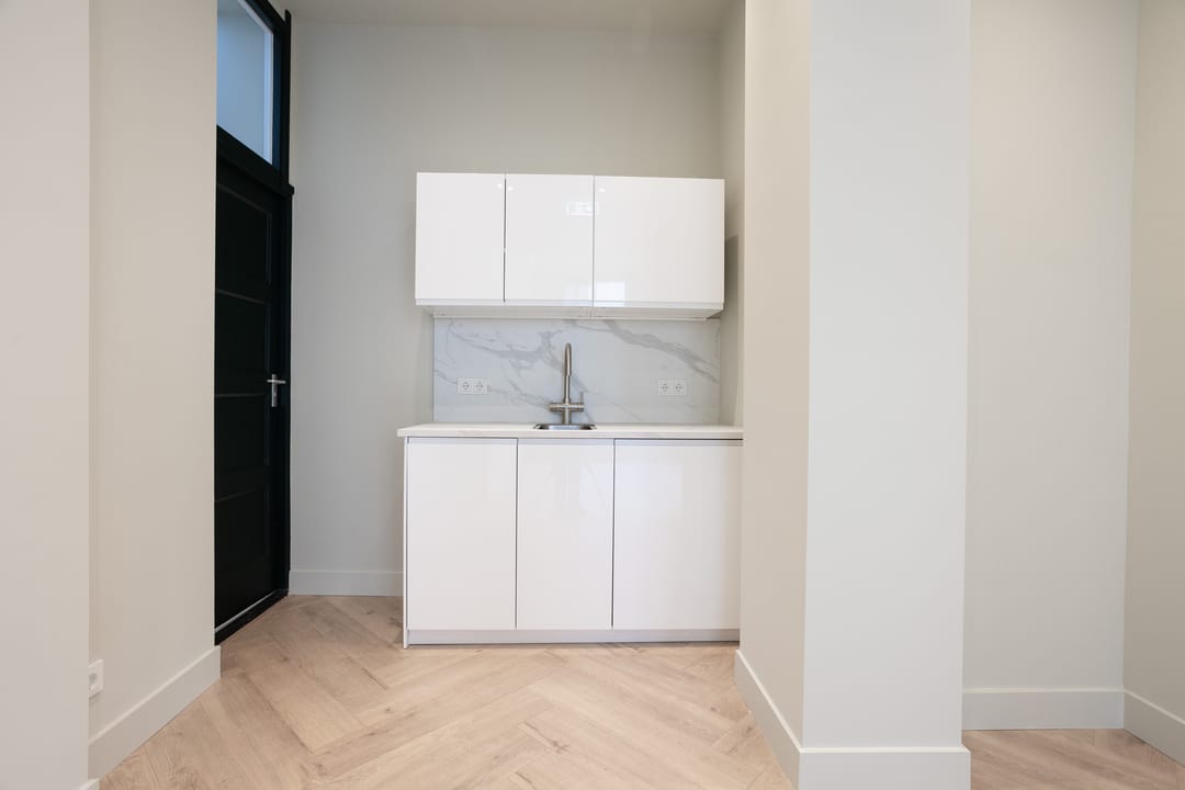 Entree, meterkast, kantoorruimte van ca. 54 m² die voorzien is van een pantry met vaatwasser, koelkast, magnetron en een kraan met kokend water. Aansluitend een modern en luxe toilet. In het souterrain bevindt zich een ruime spreek/werkkamer van ca. 18 m² met daglicht en te openen ramen en nog verschillende ruimten voor archief en opslag van ca. 22 m².