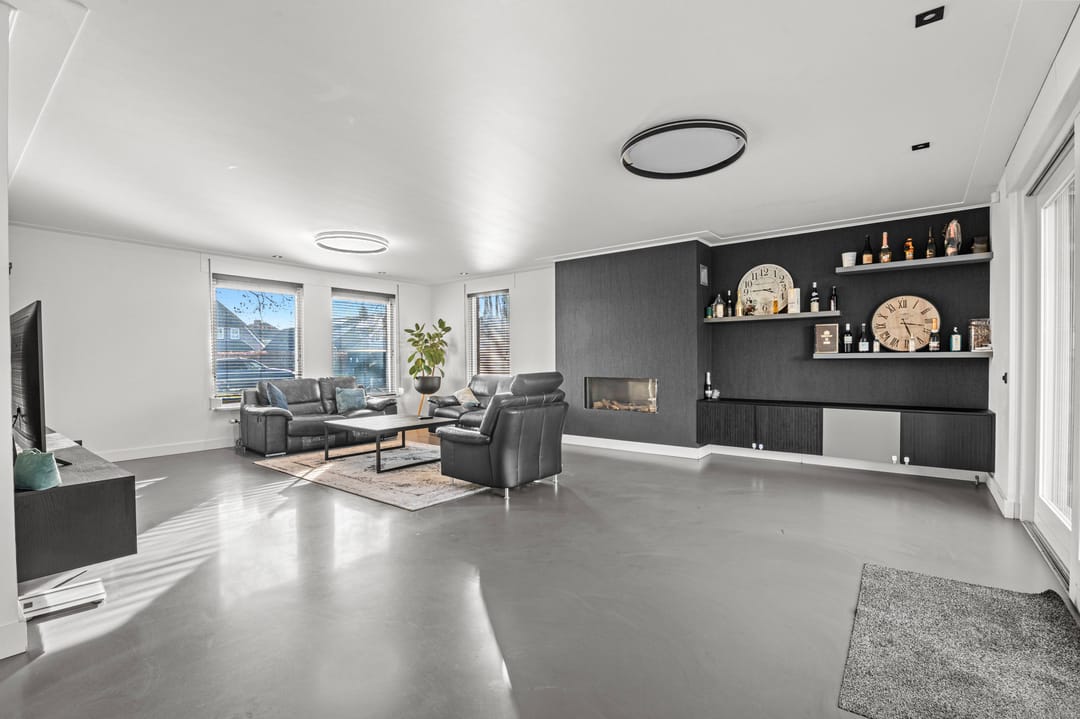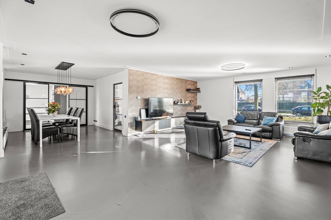 De vrijstaande bedrijfswoning, van circa 1.000 m³, ligt op een riant perceel en is toegankelijk middels een representatieve entree waar tevens de sanitaire voorzieningen en de trapopgang (naar zowel de kelder als de verdieping) zijn gesitueerd. De luxe woonkamer (voorzien van een gashaard) is ruim opgezet en staat middels een schuifpui in verbinding met de tuin die beschikt over een chalet. De moderne keuken is uitgerust met inbouwapparatuur en toegankelijk via de woonkamer en de bijkeuken. Aan de rechterzijde van de woning is eveneens een entree gesitueerd die toegang biedt tot een kantoorruimte, badkamer en slaapkamer. Gelijkvloers wonen behoort dan ook tot de mogelijkheden. De eerste verdieping is onderverdeeld in een viertal slaapkamers en badkamer voorzien van een douche en ligbad. Middels een vlizotrap is de ruime bergzolder bereikbaar.