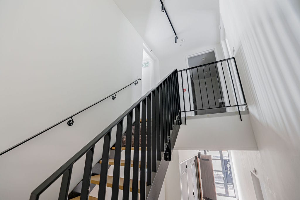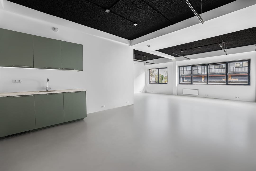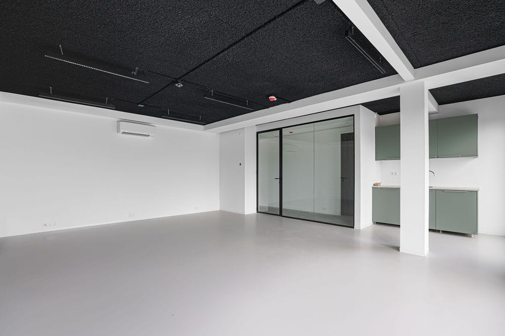 - Een industrieel plafond (akoestisch afgewerkt) inclusief vrij hangende LED verlichtingsarmaturen;