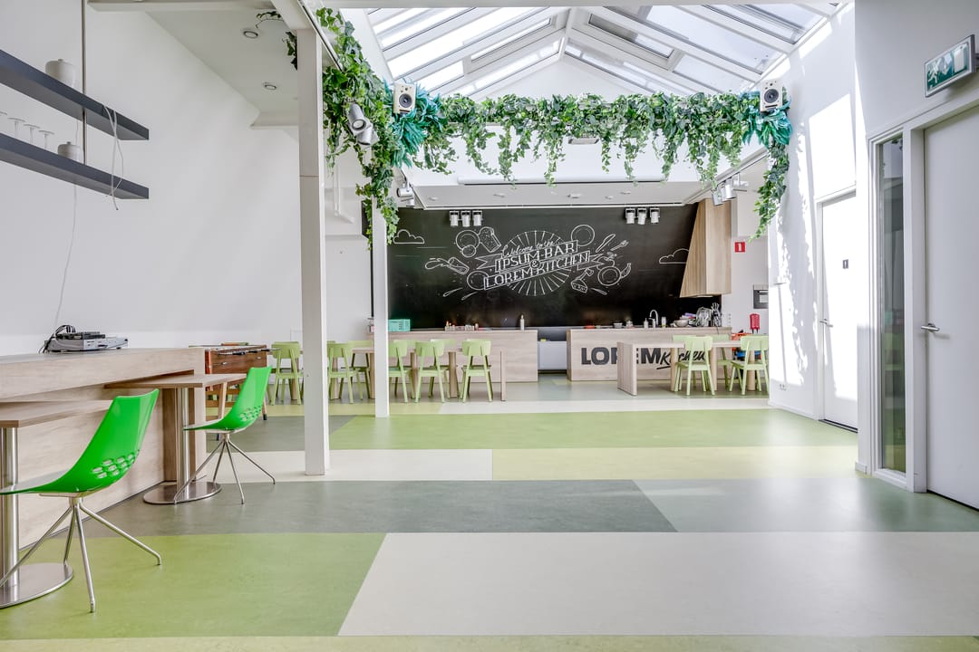 Professionele keuken voorzien van diverse apparatuur, bar, presentatie mogelijkheden, toiletruimte, trap met bordes en lift.