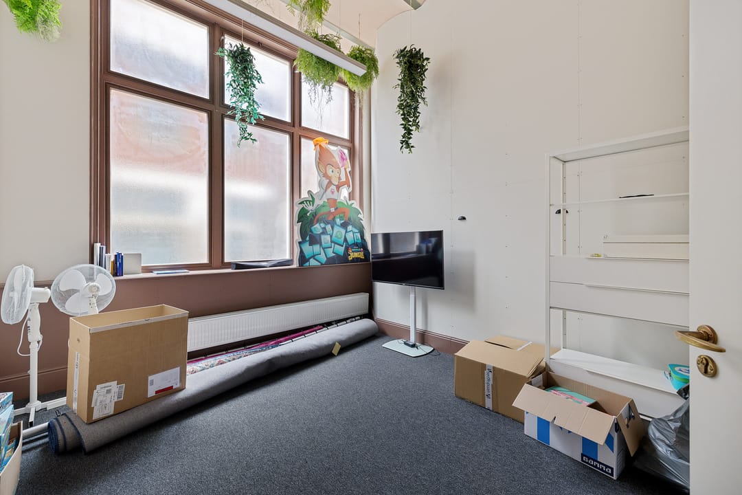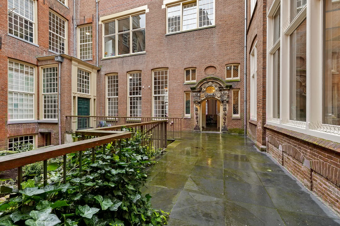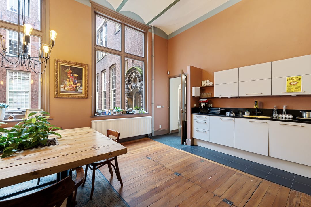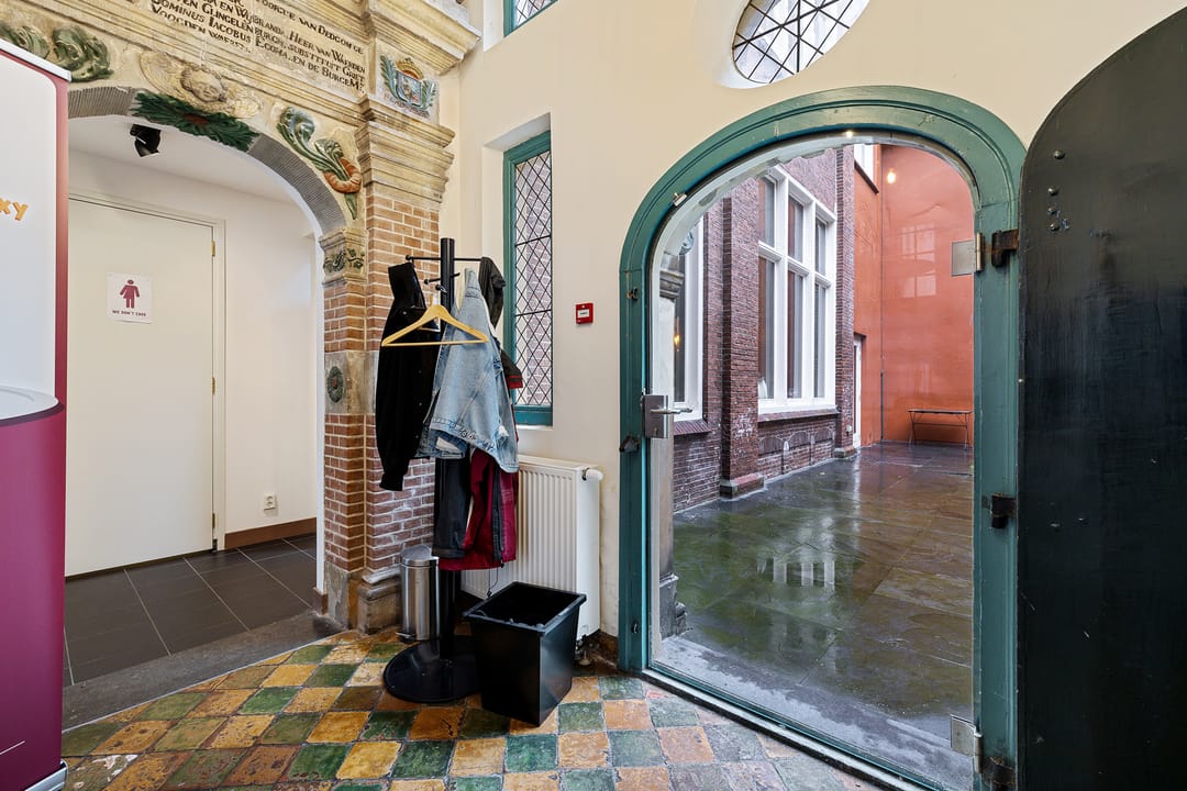 In het historische centrum is deze bijzondere en inspirerende kantoorruimte gelegen in een monumentaal gebouw met een rijke historie. Het object combineert authentieke architectuur met een moderne en creatieve werkomgeving en kenmerkt zich door de indrukwekkende plafondhoogte, de vide en de centrale groene binnentuin. De begane grond bestaat uit een zeer royale open werkruimte van circa 109 m² met een plafondhoogte van circa 4,2 meter. De ruimte wordt gekenmerkt door monumentale kolommen, een houten vloer, grote raampartijen en een indrukwekkende lichtinval. In het midden van de ruimte bevindt zich een groene binnentuin met beplanting, waardoor een unieke en inspirerende werkomgeving ontstaat. Langs de gevel bevinden zich grote ramen met uitzicht op de karakteristieke binnenplaats van het complex. De ruimte biedt voldoende mogelijkheden voor het creëren van verschillende werkzones, zoals open werkplekken, overlegplekken en informele ontmoetingsruimten. Via een interne trap is de vide bereikbaar. Deze verdieping biedt extra werkplekken en overlegmogelijkheden met uitzicht over de centrale ruimte, waardoor een open en dynamische werkomgeving ontstaat. Aan de voorzijde van het object bevinden zich twee separate kantoor-/vergaderruimten van circa 16 m² en 17 m². Deze ruimtes zijn uitstekend geschikt als spreekkamer, directiekantoor of teamruimte. Verder beschikt het object over een pantry met keukenopstelling, een gezamenlijke ontmoetingsruimte met grote tafel, separate sanitaire voorzieningen en meerdere kelderruimten voor opslag. De kelder heeft een stahoogte van circa 2,1 meter en is geschikt voor archief- of opslagdoeleinden.