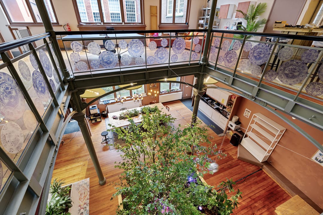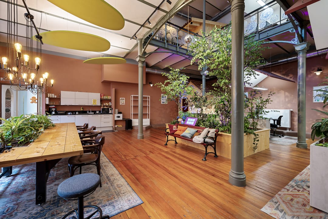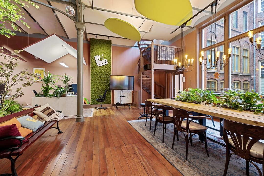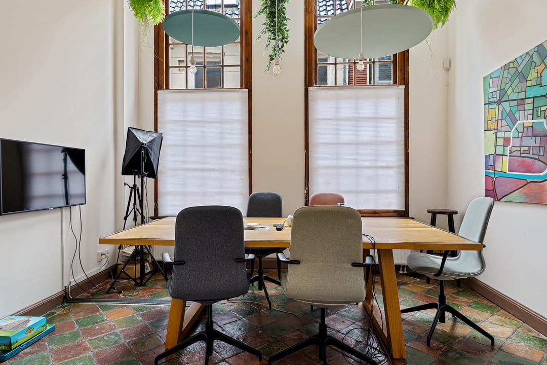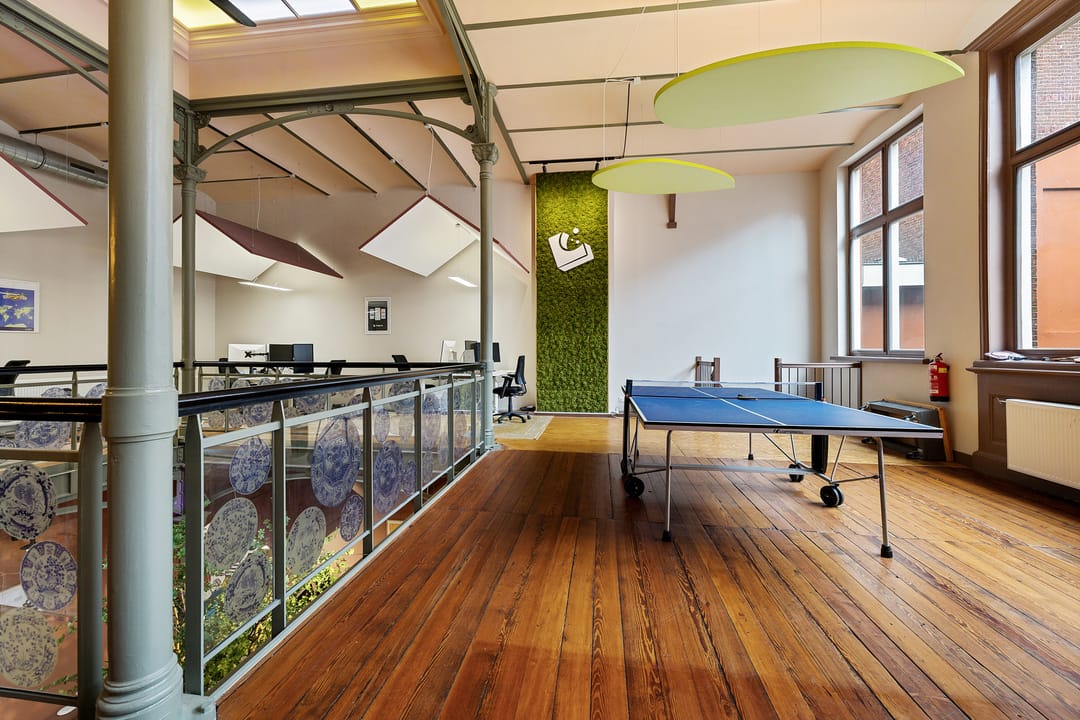 In het historische centrum is deze bijzondere en inspirerende kantoorruimte gelegen in een monumentaal gebouw met een rijke historie. Het object combineert authentieke architectuur met een moderne en creatieve werkomgeving en kenmerkt zich door de indrukwekkende plafondhoogte, de vide en de centrale groene binnentuin. De begane grond bestaat uit een zeer royale open werkruimte van circa 109 m² met een plafondhoogte van circa 4,2 meter. De ruimte wordt gekenmerkt door monumentale kolommen, een houten vloer, grote raampartijen en een indrukwekkende lichtinval. In het midden van de ruimte bevindt zich een groene binnentuin met beplanting, waardoor een unieke en inspirerende werkomgeving ontstaat. Langs de gevel bevinden zich grote ramen met uitzicht op de karakteristieke binnenplaats van het complex. De ruimte biedt voldoende mogelijkheden voor het creëren van verschillende werkzones, zoals open werkplekken, overlegplekken en informele ontmoetingsruimten. Via een interne trap is de vide bereikbaar. Deze verdieping biedt extra werkplekken en overlegmogelijkheden met uitzicht over de centrale ruimte, waardoor een open en dynamische werkomgeving ontstaat. Aan de voorzijde van het object bevinden zich twee separate kantoor-/vergaderruimten van circa 16 m² en 17 m². Deze ruimtes zijn uitstekend geschikt als spreekkamer, directiekantoor of teamruimte. Verder beschikt het object over een pantry met keukenopstelling, een gezamenlijke ontmoetingsruimte met grote tafel, separate sanitaire voorzieningen en meerdere kelderruimten voor opslag. De kelder heeft een stahoogte van circa 2,1 meter en is geschikt voor archief- of opslagdoeleinden.