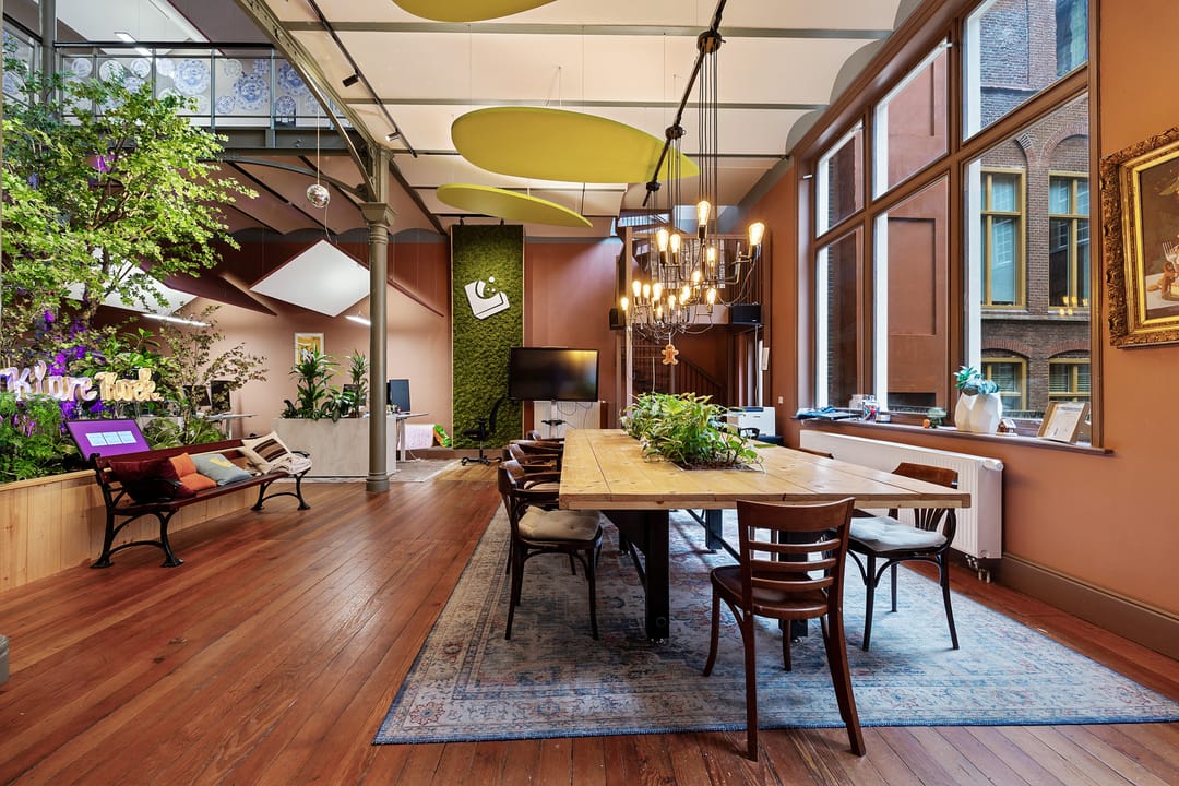 grote vergadertafel met stoelen, verlichting en ruimte voor plantenbakken