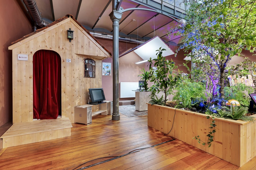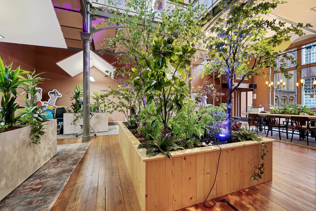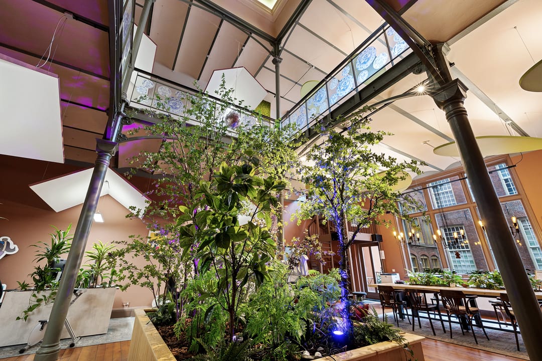 grote plantenbak met kunstbomen in de centrale ruimte