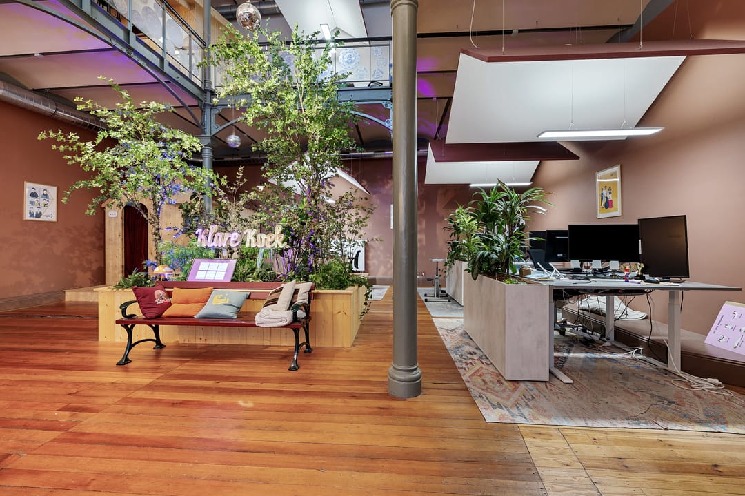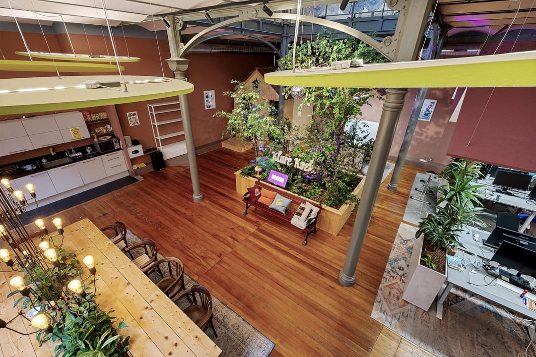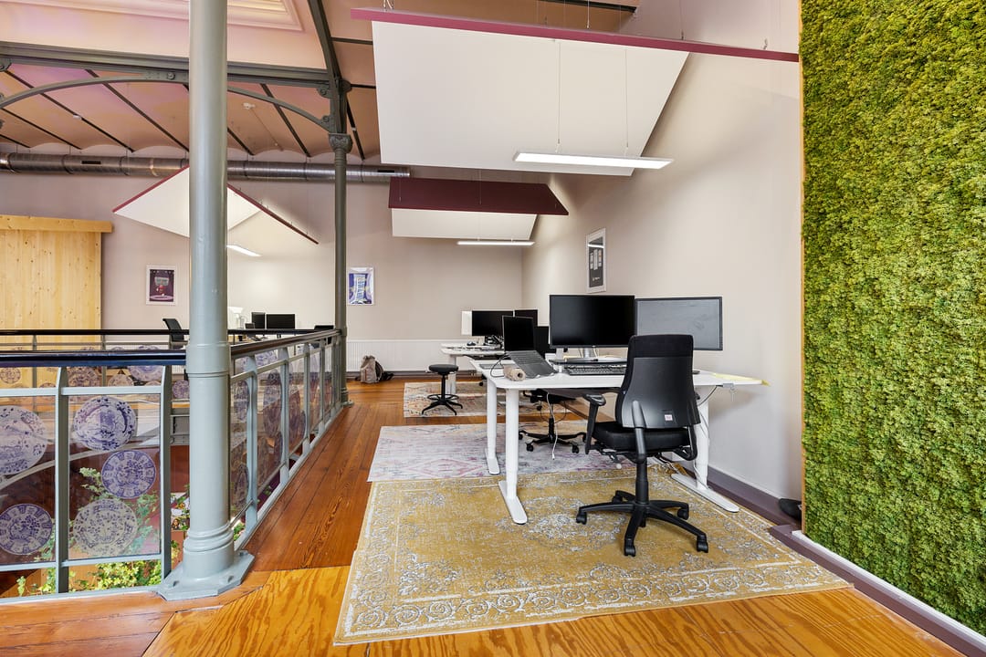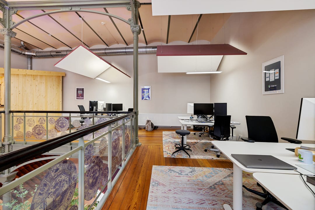 Open werkruimte met meerdere werkplekken en zicht op de ondergelegen kantoorruimte.