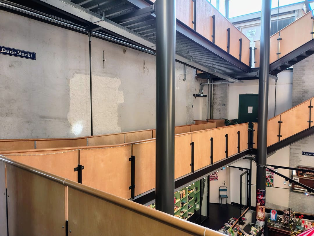 De verdiepingen zijn te bereiken door een centraal trappenhuis en/of lift. Deze verdiepingen kenmerken zich door een open vide met zicht op de boekwinkel, diverse niveauverschillen en een speelse, maar unieke uitstraling door de samensmelting van de verschillende functies.