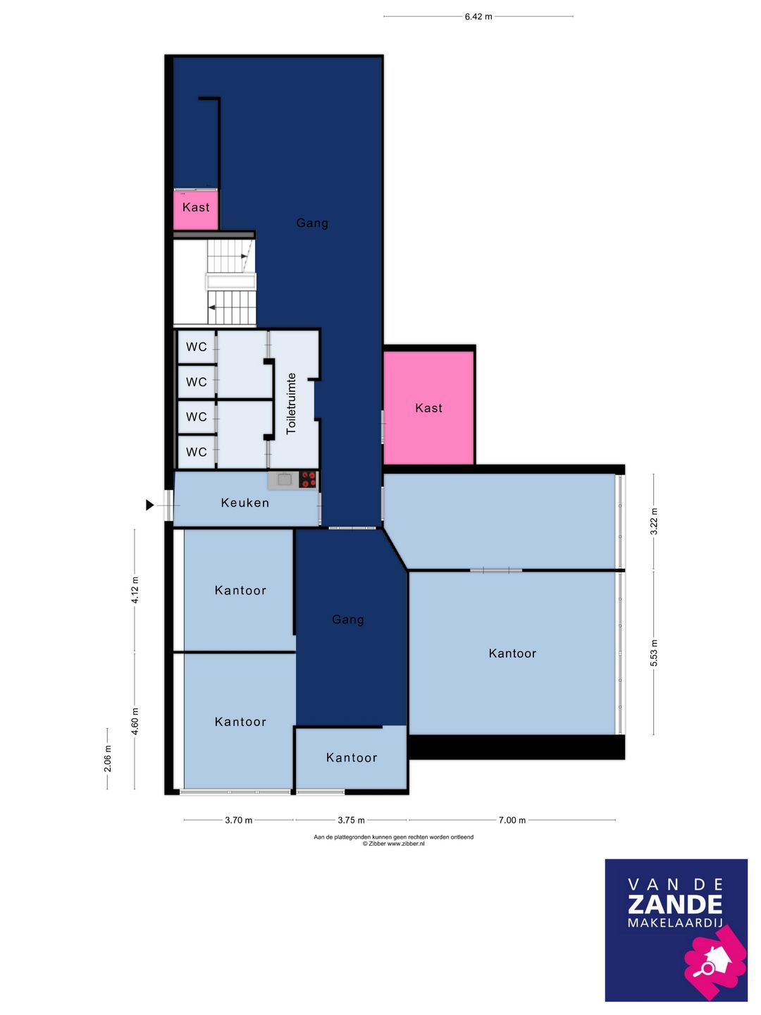 Gezamenlijke entree, trapopgang naar verdieping met ontvangstruimte en gezamenlijke toiletten. Open kantoorruimte met verschillende spreekkamers.