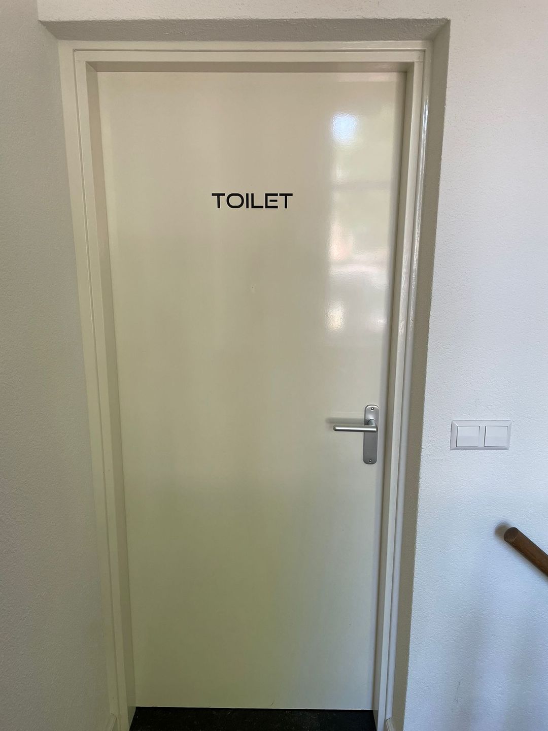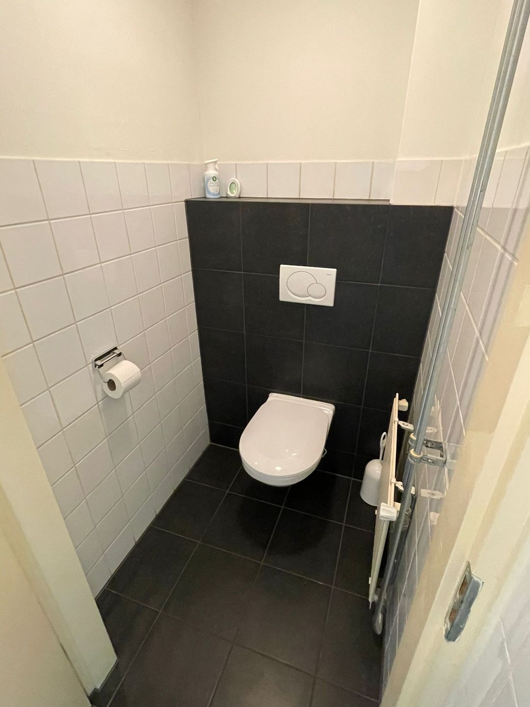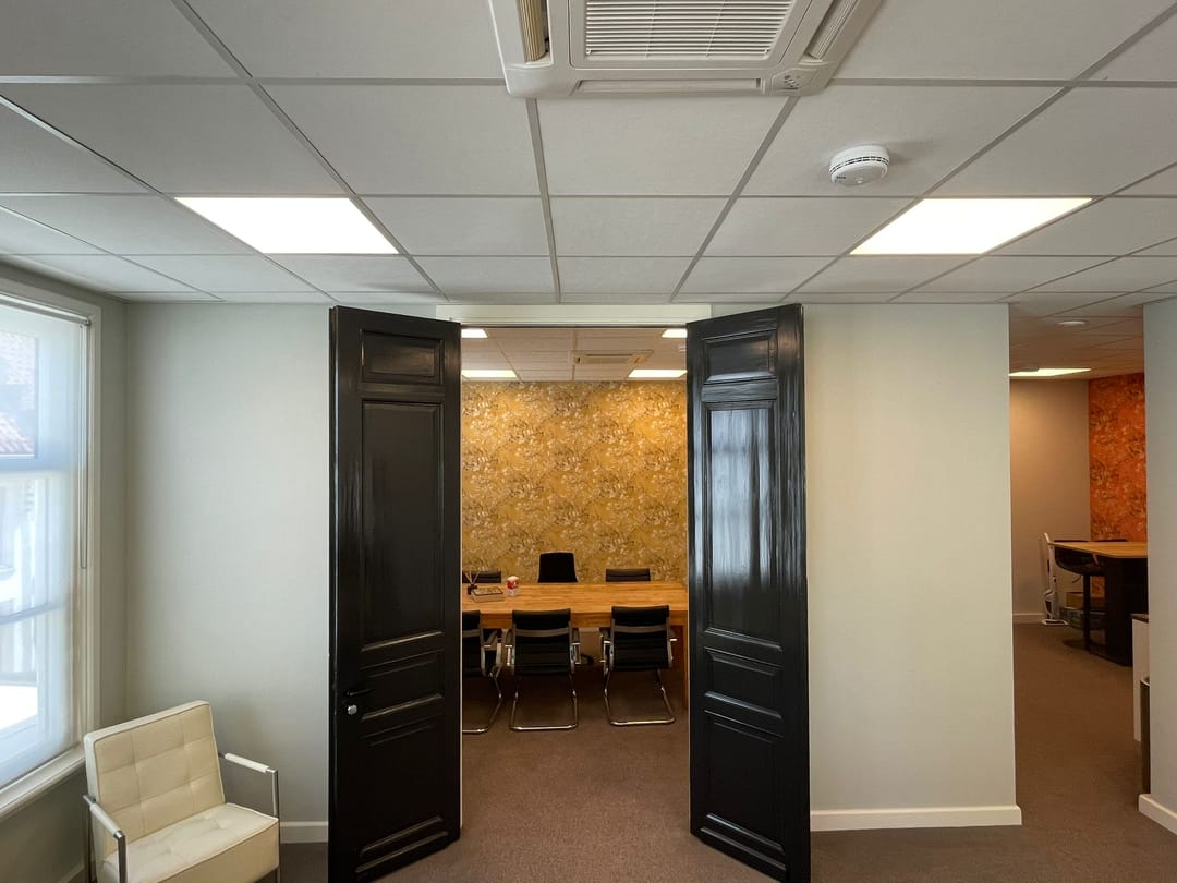 1e Verdieping: overloop met eigen moderne toiletruimte v.v. hangend toilet en fonteintje. Grote open kantoorruimte met een oppervlakte van ca. 30 m2 en aansluitend toegang via authentieke openslaande deuren tot 2e kantoorruimte (opp. ca. 17 m2), te gebruiken als directiekantoor en/of spreekkamer.