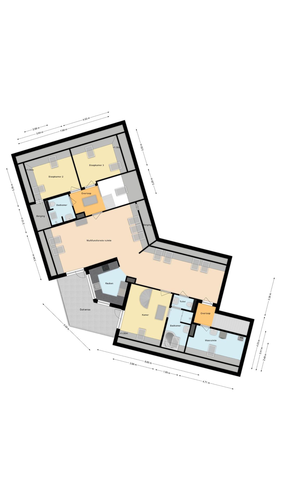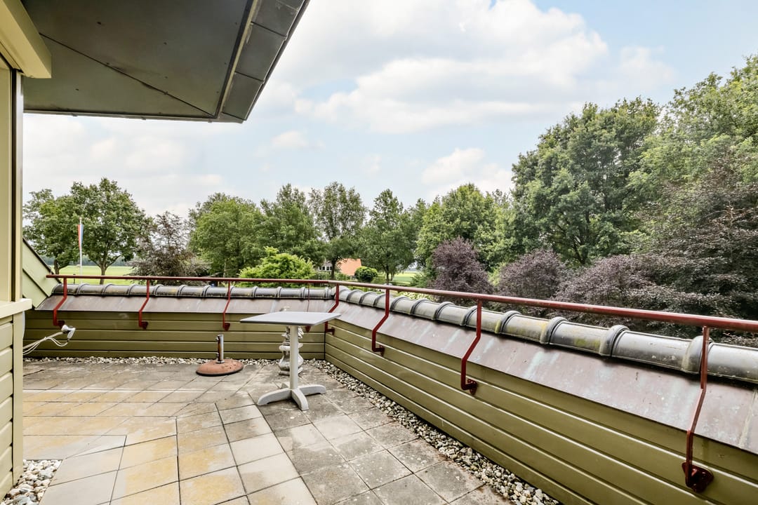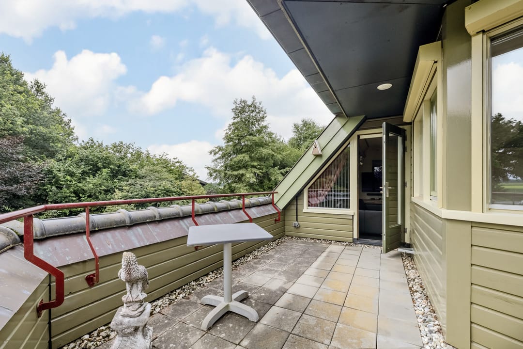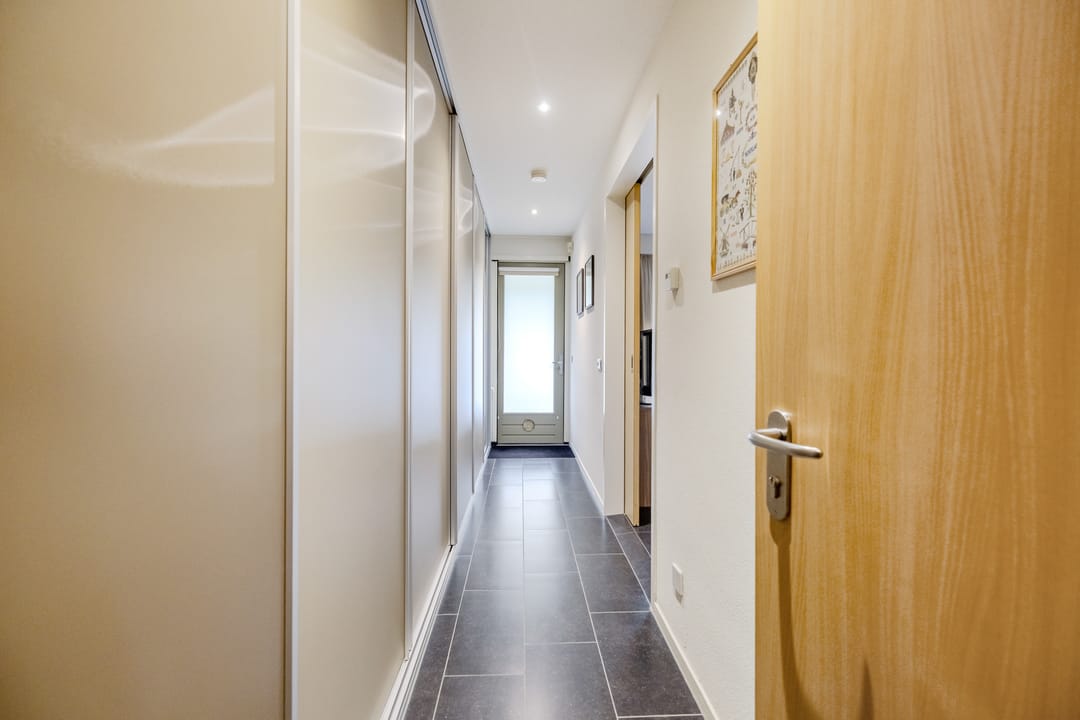 - Overloop, bijkeuken, badkamer, slaapkamer met balkon, keuken en woonkamer.