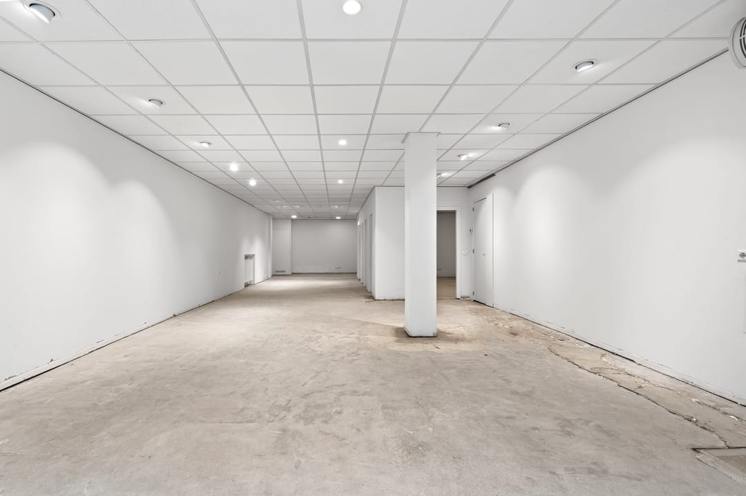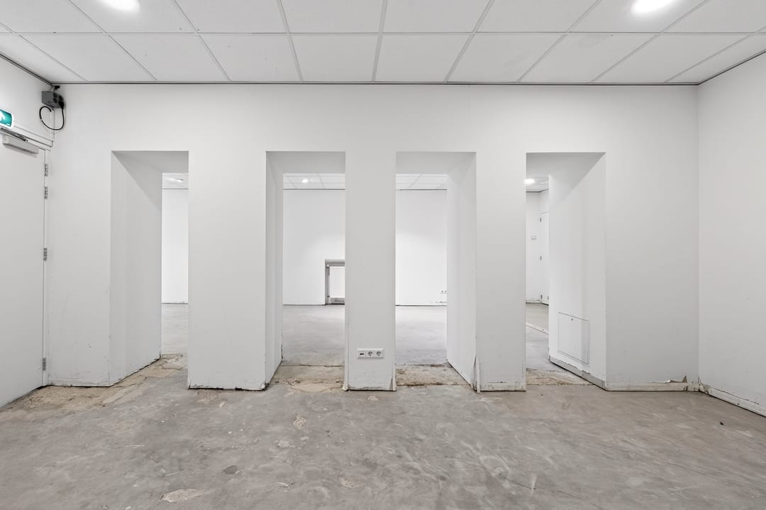 At the front, the retail space is 5.75 metres wide, widening halfway through to a total width of 7.25 metres. This section is playfully divided into two by a colonnade. The rear section of the unit follows, where a recently modernised enclosed pantry and a separate toilet are located. The total depth of the space is approximately 15 metres.