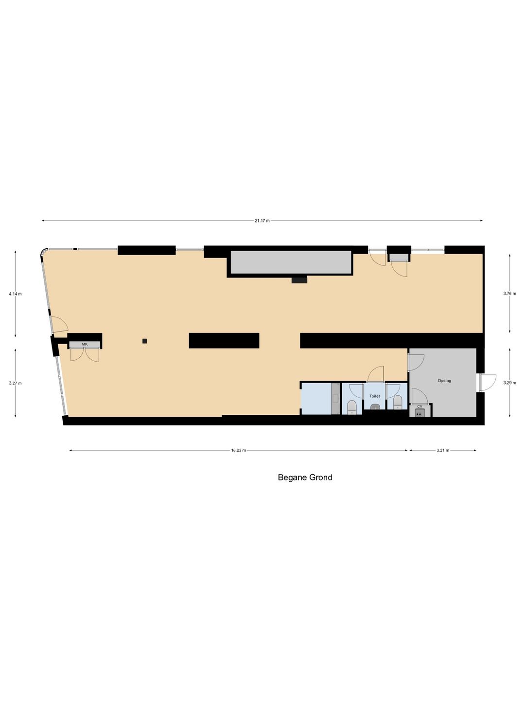 De begane grond omvat circa 143 m² v.v.o. winkelruimte. De entree bevindt zich aan de voorzijde, met een diepe en grotendeels open winkelruimte direct daarachter. Aan de achterzijde bevinden zich een pantry, separate toiletten en een opslagruimte, wat zorgt voor een duidelijke scheiding tussen verkoopruimte en ondersteunende functies.