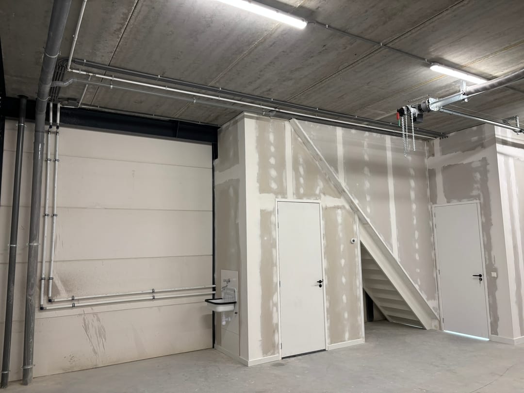 Bedrijfsruimte op de begane grond met meterkast en toilet onder trap en een uitstortgootsteen. Deze ruimte is toegankelijk middels een loopdeur in de pui of via de elektrische overheaddeur.