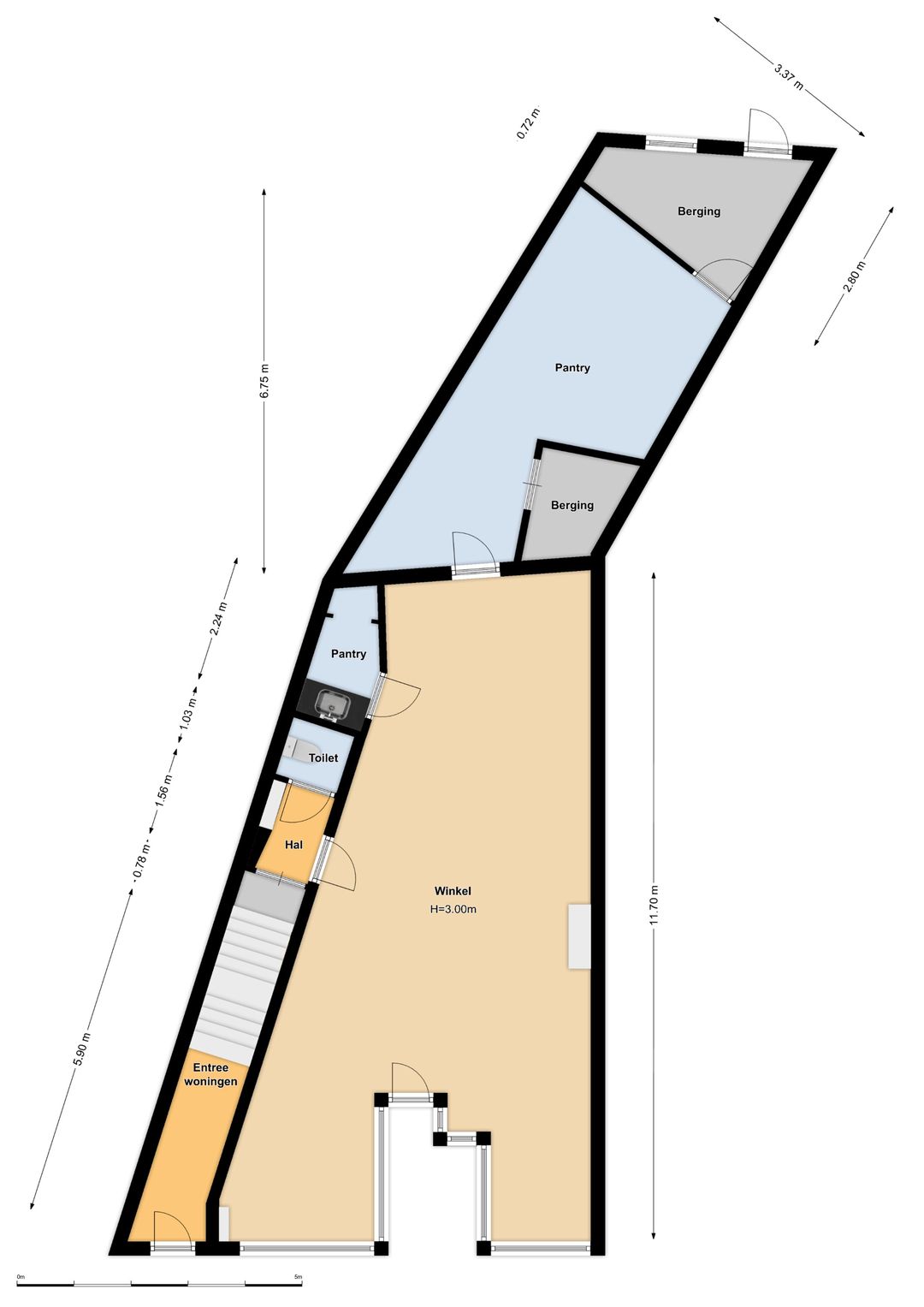 De winkelunit heeft een uniek gebogen front en kent de navolgende metrages:
