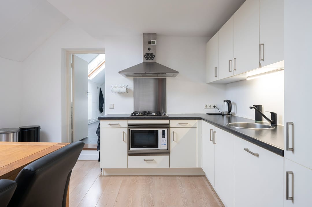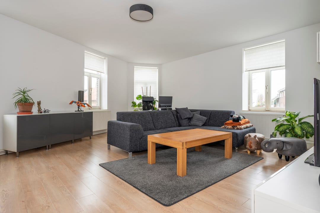De woonkamer is een royale leefruimte, met grote ramen aan de kant van de Rijksweg en de Pastoor Brouwersstraat. Aansluitend is de eetkeuken, met een groot dakraam en genoeg plek voor een grote eettafel. De lichte hoekopstelling is voorzien van een gaskookplaat, afzuigkap, vaatwasser en koelkast.