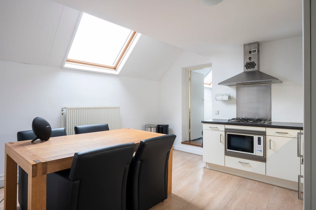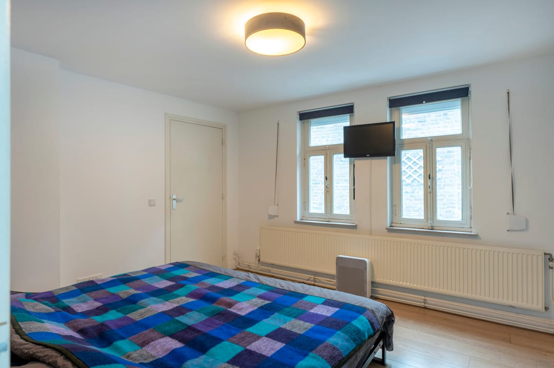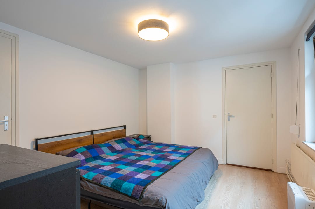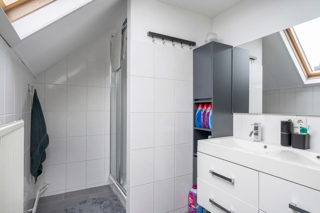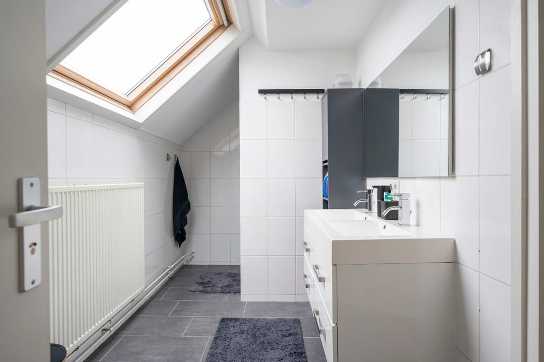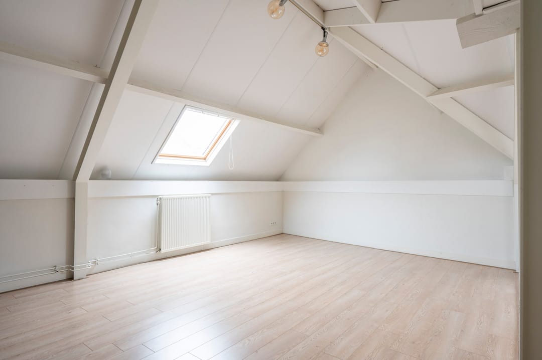 De slaapkamer, die aan het dakterras grenst, is groot genoeg om in te richten als tweepersoonskamer. In de naastgelegen badkamer is de ruimte ingedeeld met een douche en een dubbel wastafelmeubel. Grote, witte wandtegels zijn gecombineerd met grijze tegels op de vloer. Verrassend is de achterste ruimte, met zicht tot in de nok en drie grote dakramen. Deze ruimte kan worden gebruikt als slaapkamer, werkkamer, hobbyruimte of atelier. Splitsen in twee kamers is ook mogelijk!