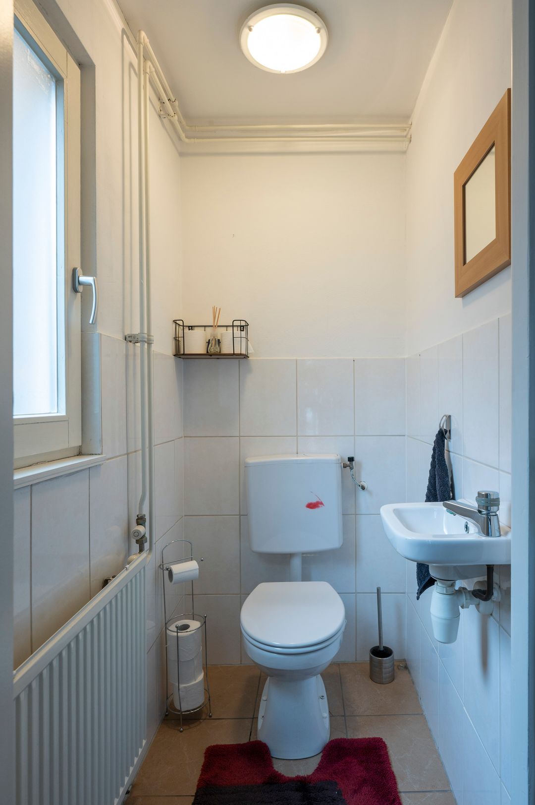 Op de eerste verdieping bereikt u als eerste een ruime, lichte overloop. Een van de ruimtes die hieraan grenst, is de toiletruimte met fonteintje. Aan de andere zijde, bij het raam, is de opstelling van de wasapparatuur.