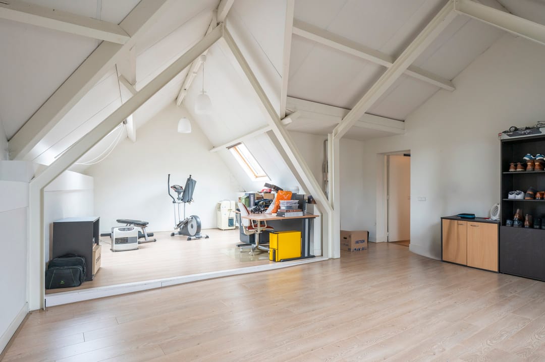 Een vaste trap geeft toegang tot de tweede verdieping. Vanaf de overloop is een grote zolderruimte te bereiken, met de opstelling van de HR-ketel. Gezien de grootte van deze ruimte is het mogelijk om hier een extra (slaap)kamer te realiseren.